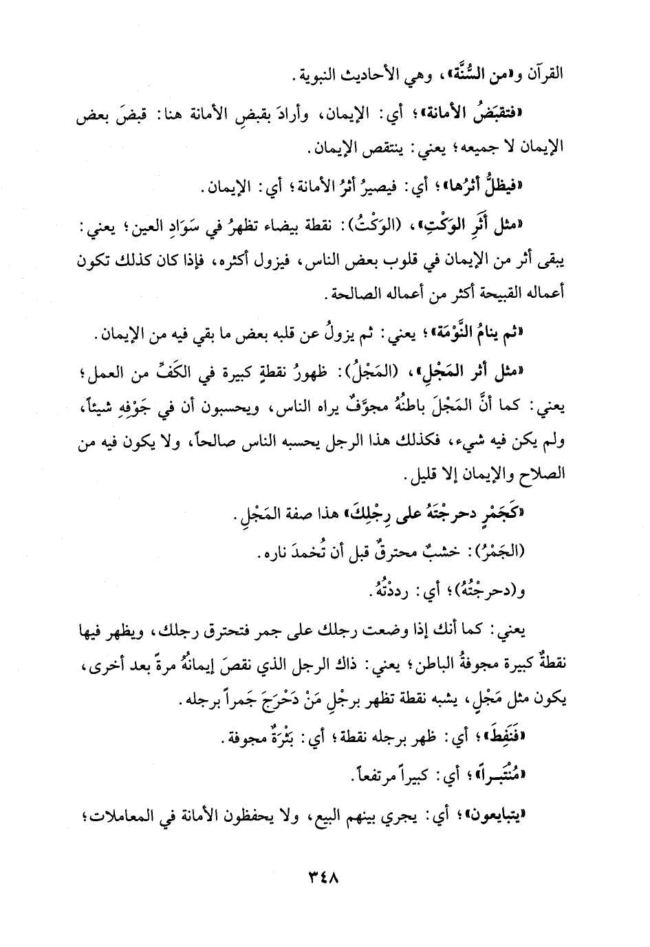 "مثل أَثَرِ الوَكْتِ"، (الوَكْتُ): نقطة بيضاء تظهرُ في سَوَادِ العين؛ يعني: يبقى أثر من الإيمان في قلوب بعض الناس، فيزول أكثره، فإذا كان كذلك تكون أعماله القبيحة أكثر من أعماله الصالحة.