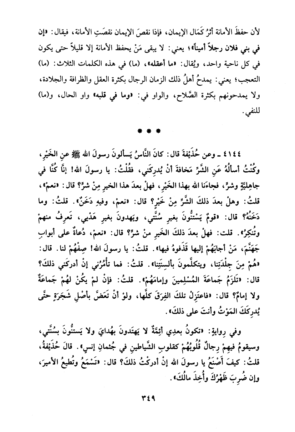 4144 - وعن حُذَيْفةَ قال: كانَ النَّاسُ يَسألونَ رسولَ الله - صلى الله عليه وسلم - عنِ الخَيْرِ، وكُنْتُ أسألُهُ عَنِ الشَّرِّ مَخافةَ أنْ يُدرِكَني، فقُلْتُ: يا رسولَ الله! إنَّا كُنَّا في جاهِليَّةٍ وشرٍّ، فجاءَنا الله بهذا الخَيْرِ، فهلْ بعدَ هذا الخيرِ مِنْ شرٍّ؟ قال: "نعمْ"، قلتُ: وهلْ بعدَ ذلكَ الشَّرِّ مِنْ خَيْرٍ؟ قال: "نعمْ، وفيهِ دَخَنٌ". قلتُ: وما دَخَنُهُ؟ قال: "قومٌ يَسْتنُّونَ بغيرِ سُنَّتي، ويَهدونَ بغيرِ هَدْيي، تَعرِفُ منهمْ وتُنكِرُ". قلت: فهلْ بعدَ ذلكَ الخَيرِ منْ شرٍّ؟ قال: "نعمْ، دُعاةٌ على أبوابِ جَهَنَّمَ، مَنْ أجابَهُمْ إليها قَذَفوهُ فيها". قلتُ: يا رسولَ الله! صِفْهُمْ لنا. قال: "هُمْ مِنَ جِلْدَتِنا، ويتكلَّمونَ بألسِنَتِنا". قلتُ: فما تأْمُرُني إنْ أدركَني ذلكَ؟ قال: "تَلزَمُ جَماعَةَ المُسْلِمينَ وإمامَهُمْ". قلتُ: فإنْ لَمْ يكُنْ لَهُمْ جَماعَةٌ ولا إمامٌ؟ قال: "فاعتَزِلْ تلكَ الفِرَقَ كلَّها، ولوْ أنْ تَعَضَّ بأصْلِ شَجَرَةٍ حتَّى يُدرِكَكَ المَوْتُ وأنتَ على ذلكَ".