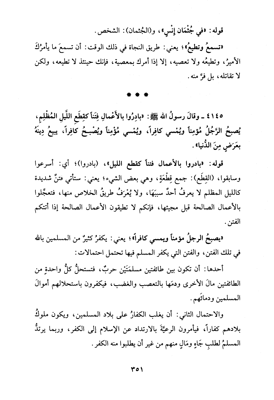 4145 - وقالَ رسولُ الله - صلى الله عليه وسلم -: "بادِرُوا بالأَعْمالِ فِتَنًا كقِطَعِ اللَّيل المُظْلِمِ، يُصبحُ الرَّجُلُ مُؤمِنًا ويُمْسي كافِرًا، ويُمْسي مُؤْمِنًا ويُصْبحُ كافِرًا، يبيعُ دِينَهُ بعَرَضٍ مِنَ الدُّنيا".