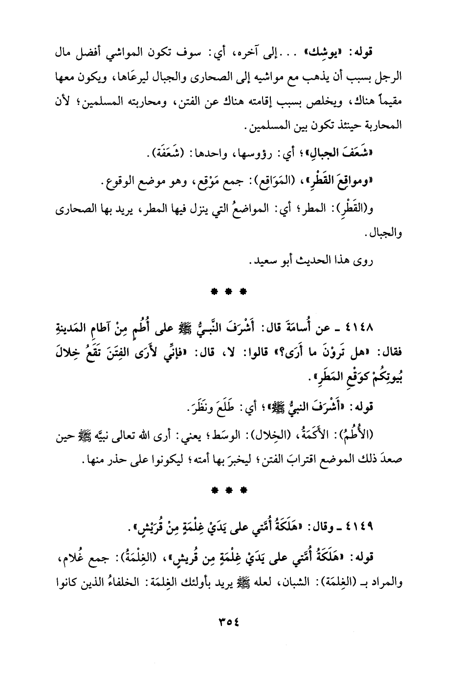 4148 - عن أُسامَةَ قال: أَشْرَفَ النَّبيُّ - صلى الله عليه وسلم - على أُطُمٍ مِنْ آطامِ المَدينةِ فقال: "هل تَروْنَ ما أَرَى؟ " قالوا: لا، قال: "فإنِّي لأَرَى الفِتَنَ تَقَعُ خِلالَ بُيوتِكُمْ كوَقْعِ المَطَرِ".
