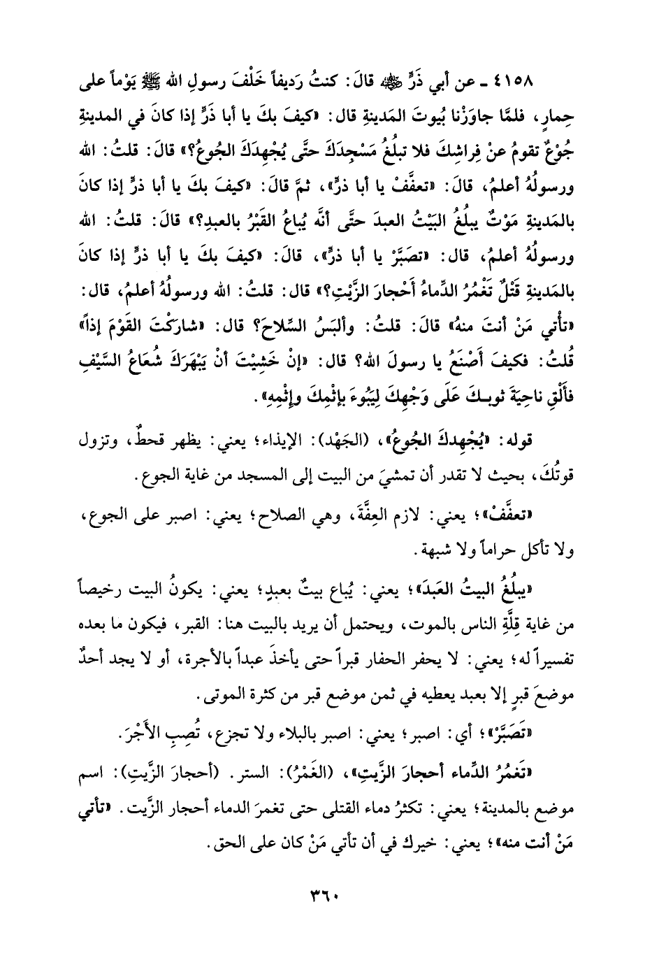 4158 - عن أبي ذَرٍّ - رضي الله عنه - قالَ: كنتُ رَديفًا خَلْفَ رسولِ الله - صلى الله عليه وسلم - يَوْمًا على حِمارٍ، فلمَّا جاوَزْنا بُيوتَ المَدينةِ قال: "كيفَ بكَ يا أبا ذَرٍّ إذا كَانَ في المدينةِ جُوْعٌ تقومُ عنْ فِراشِكَ فلا تبلُغُ مَسْجِدَكَ حتَى يُجْهِدَكَ الجُوعُ؟ " قالَ: قلتُ: الله ورسولُهُ أعلمُ، قالَ: "تعفَّفْ يا أبا ذرٍّ"، ثمَّ قالَ: "كيفَ بكَ يا أبا ذرٍّ إذا كانَ بالمَدينةِ مَوْتٌ يبلُغُ البَيْتُ العبدَ حتَّى أنَّه يُباعُ القَبْرُ بالعبدِ؟ " قالَ: قلتُ: الله ورسولُهُ أعلمُ، قال: "تصَبَّرْ يا أبا ذرٍّ"، قالَ: "كيفَ بكَ يا أبا ذرٍّ إذا كانَ بالمَدينةِ قَتْلٌ تَغْمُرُ الدِّماءُ أَحْجارَ الزَّيْتِ؟ " قال: قلتُ: الله ورسولُهُ أعلمُ، قال: "تأْتي مَنْ أنتَ منهُ" قالَ: قلتُ: وألبَسُ السِّلاحَ؟ قال: "شارَكْتَ القَوْمَ إذًا" قُلتُ: فكيفَ أَصْنَعُ يا رسولَ الله؟ قال: "إنْ خَشِيْتَ أنْ يَبْهَرَكَ شُعَاعُ السَّيْفِ فأَلْقِ ناحِيَةَ ثوبكَ عَلَى وَجْهِكَ لِيَبُوءَ بإثْمِكَ وإِثْمِهِ".