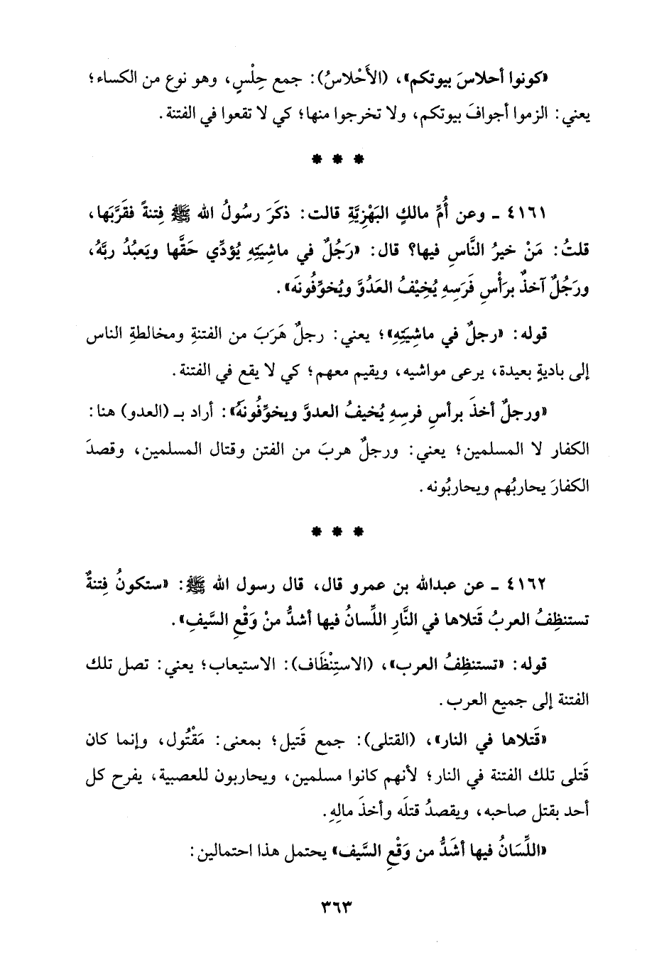 4162 - عن عبد الله بن عمرو قال، قال رسول الله - صلى الله عليه وسلم -: "ستكونُ فِتنةٌ تستنظِفُ العربُ قَتلاها في النَّارِ اللِّسانُ فيها أشدُّ منْ وَقْعِ السَّيفِ".
