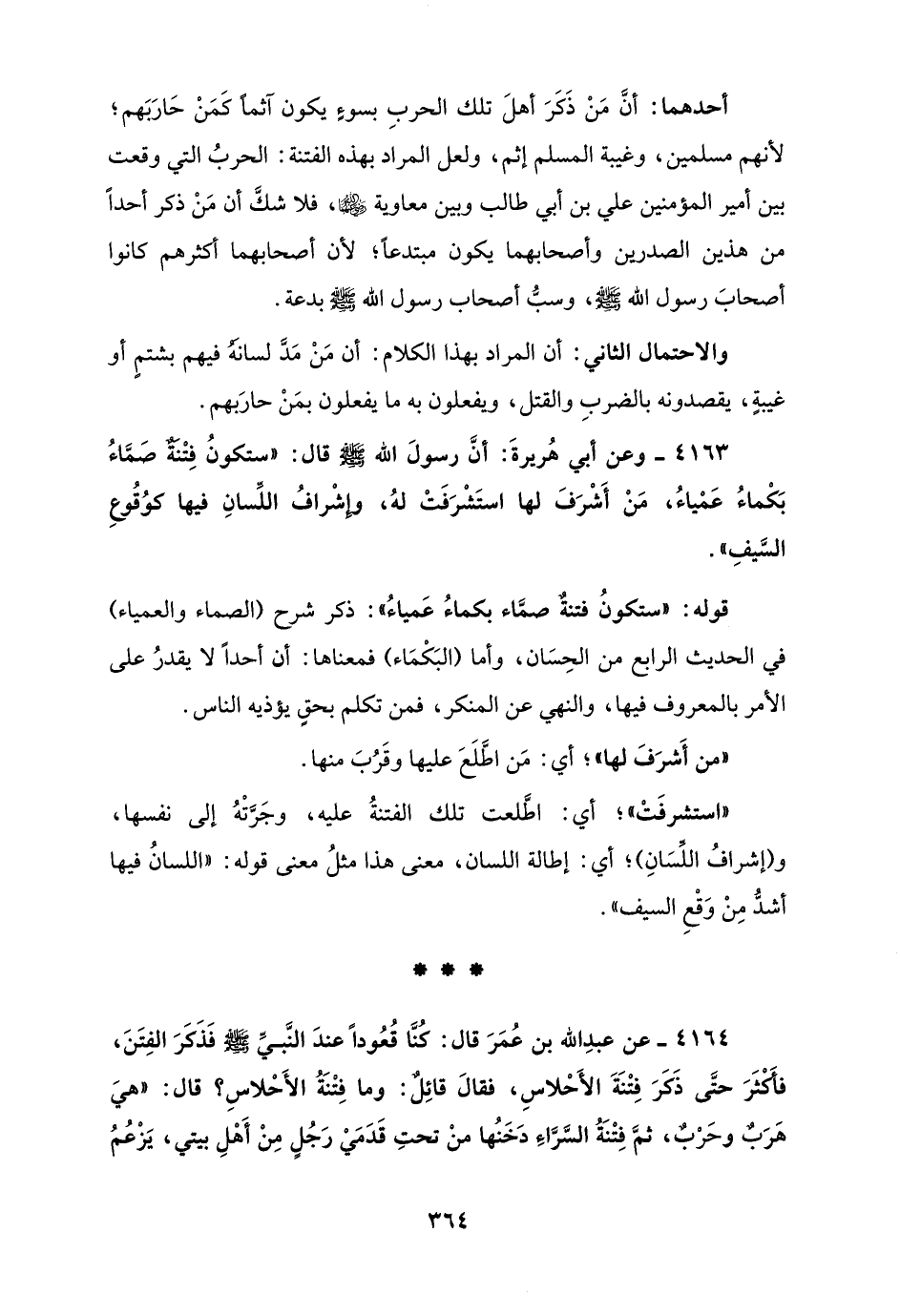 أحدهما: أنَّ مَنْ ذَكَرَ أهلَ تلك الحربِ بسوءٍ يكون آثمًا كَمَنْ حَارَبَهم؛ لأنهم مسلمين، وغيبة المسلم إثم، ولعل المراد بهذه الفتنة: الحربُ التي وقعت بين أمير المؤمنين علي بن أبي طالب وبين معاوية - رضي الله عنهما -، فلا شكَّ أن مَنْ ذكر أحدًا من هذين الصدرين وأصحابهما يكون مبتدعًا؛ لأن أصحابهما أكثرهم كانوا أصحابَ رسول الله - صلى الله عليه وسلم -، وسبُّ أصحاب رسول الله - صلى الله عليه وسلم - بدعة.