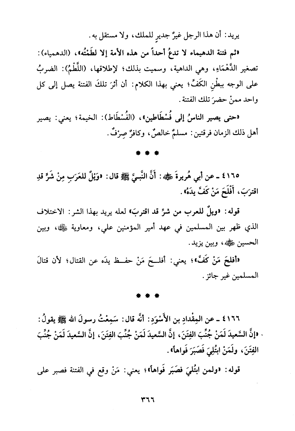 4166 - عن المِقْدادِ بن الأَسْوَدِ: أنَّه قال: سَمِعْتُ رسولَ الله - صلى الله عليه وسلم - يقولُ: "إنَّ السَّعيدَ لَمَنْ جُنِّبَ الفِتَنَ، إنَّ السَّعيدَ لَمَنْ جُنِّبَ الفِتَنَ، إنَّ السَّعيدَ لَمَنْ جُنِّبَ الفِتَنَ، ولَمَنْ ابتُلِيَ فَصَبَرَ فَواهًا".