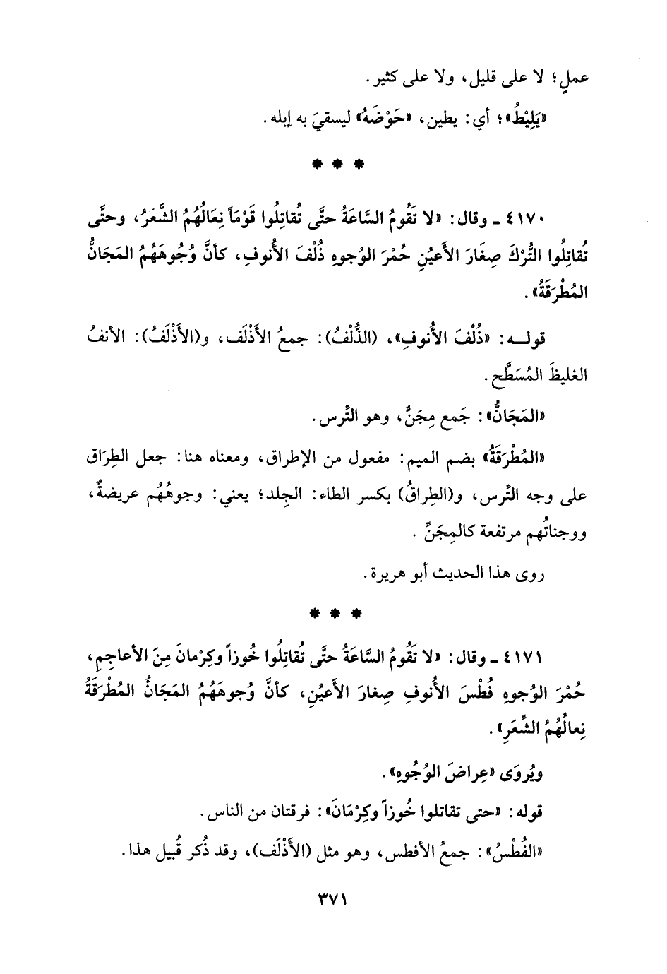 4170 - وقال: "لا تَقُومُ السَّاعَةُ حتَّى تُقاتِلُوا قَوْمًا نِعَالُهُمُ الشَّعَرُ، وحتَّى تُقاتِلُوا التُّرْكَ صِغَارَ الأَعيُنِ حُمْرَ الوُجوهِ ذُلْفَ الأُنوفِ، كأنَّ وُجُوهَهُمُ المَجَانُّ المُطْرَقَةُ".