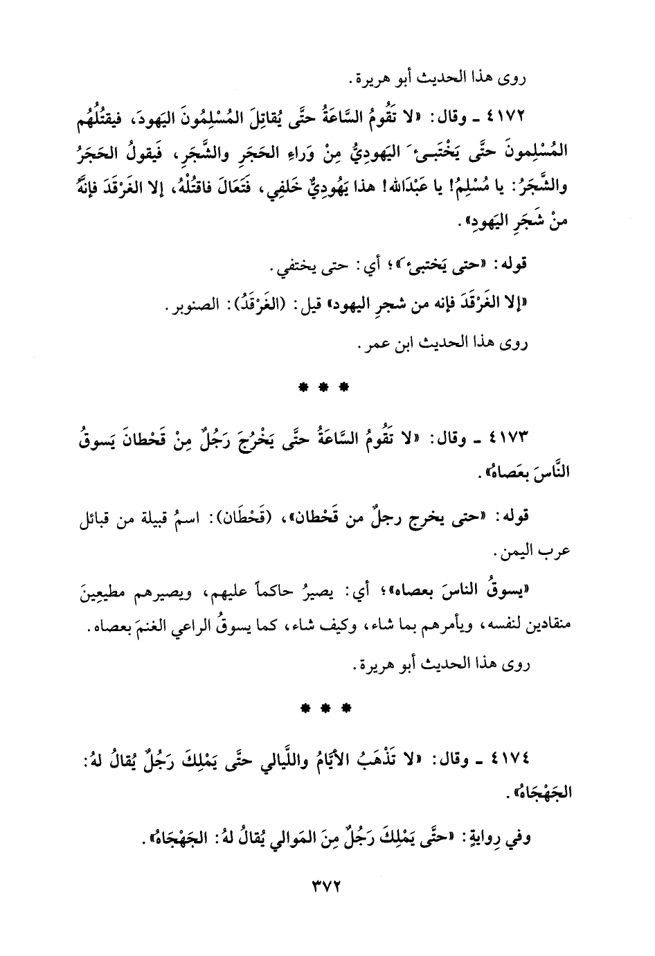 4173 - وقال: "لا تَقُومُ السَّاعَةُ حتى يَخْرُجَ رَجُلٌ مِنْ قَحْطانَ يَسوقُ النَّاسَ بعَصاهُ".