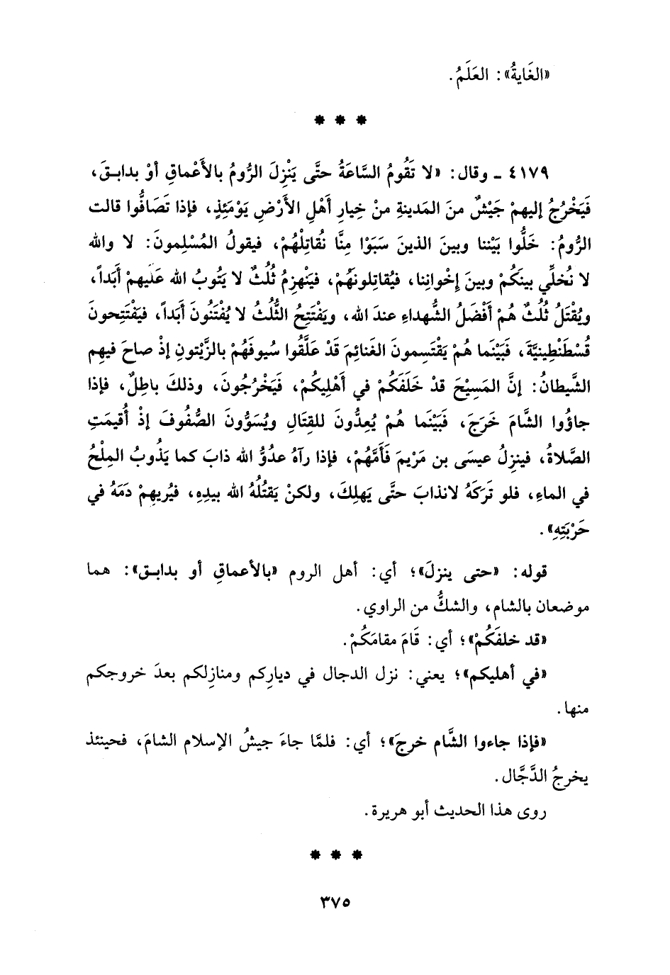 4179 - وقال: "لا تَقُومُ السَّاعَةُ حتَّى يَنْزِلَ الرُّومُ بالأَعْماقِ أوْ بدابقَ، فَيَخْرُجُ إليهمْ جَيْشٌ منَ المَدينةِ منْ خِيارِ أَهْلِ الأَرْضِ يَوْمَئِذٍ، فإذا تَصَافُّوا قالت الرُّومُ: خَلُّوا بَيْننا وبينَ الذينَ سَبَوْا مِنَّا نُقاتِلْهُمْ، فيقولُ المُسْلِمونَ: لا والله لا نُخلِّي بينَكُمْ وبينَ إِخْوانِنا، فيُقاتِلونَهُمْ، فيَنْهزِمُ ثُلُثٌ لا يَتُوبُ الله عَلَيهمْ أَبَدًا، ويُقْتَلُ ثُلُثٌ هُمْ أَفْضَلُ الشُّهداءِ عندَ الله، ويَفْتَتِحُ الثُّلُثُ لا يُفْتَنُونَ أَبَدًا، فيَفْتَتِحونَ قُسْطَنْطِينيَّةَ، فَبَيْنَما هُمْ يَقْتَسِمونَ الغَنائِمَ قَدْ عَلَّقُوا سُيوفَهُمْ بالزَّيْتونِ إذْ صاحَ فيهِم الشَّيطانُ: إنَّ المَسِيْحَ قدْ خَلَفَكُمْ في أَهْلِيكُمْ، فَيَخْرُجُونَ، وذلكَ باطِلٌ، فإذا جاؤُوا الشَّامَ خَرَجَ، فَبَيْنَما هُمْ يُعِدُّونَ للقِتَالِ ويُسَوُّونَ الصُّفُوفَ إذْ أُقيمَتِ الصَّلاةُ، فينزِلُ عيسَى بن مَرْيمَ فَأَمَّهُمْ، فإذا رآهُ عدُوُّ الله ذابَ كما يَذُوبُ المِلْحُ في الماءِ، فلو تَرَكَهُ لانذابَ حتَّى يَهلِكَ، ولكنْ يَقتُلُهُ الله بيدِهِ، فيُريهِمْ دَمَهُ في حَرْبَتِهِ".