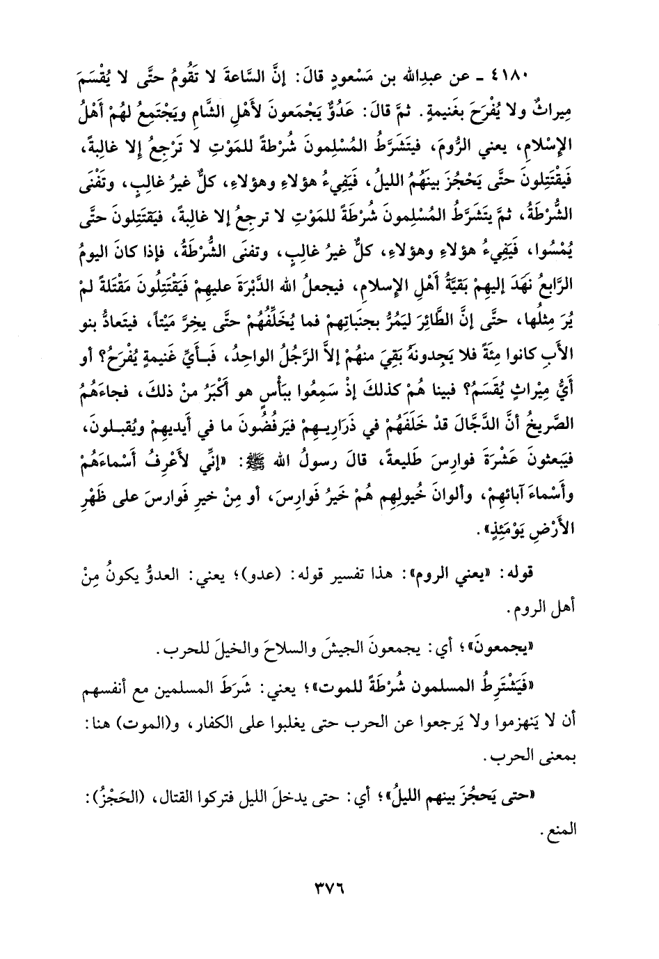 4180 - عن عبدِ الله بن مَسْعودٍ قالَ: إنَّ السَّاعةَ لا تَقُومُ حتَّى لا يُقْسَمَ مِيراثٌ ولا يُفْرَحَ بغَنيمةٍ. ثمَّ قالَ: عَدُوٌّ يَجْمَعونَ لأَهْلِ الشَّامِ ويَجْتَمِعُ لَهُمْ أَهْلُ الإِسْلامِ، يعني الرُّومَ، فيتَشَرَّطُ المُسْلِمونَ شُرْطةً للمَوْتِ لا تَرْجِعُ إِلا غالِبةً، فَيقْتَتِلونَ حتَّى يَحْجُزَ بينَهُمُ الليلُ، فَيَفِيءُ هؤلاءِ وهؤلاءِ، كلٌّ غيرُ غالِبٍ، وتَفْنَى الشُّرْطَةُ، ثمَّ يتَشَرَّطُ المُسْلِمونَ شُرْطَةً للمَوْتِ لا ترجِعُ إلا غالِبةً، فيَقتَتِلونَ حتَّى يُمْسُوا، فَيَفِيءُ هؤلاءِ وهؤلاءِ، كلٌّ غيرُ غالِبٍ، وتفنَى الشُّرْطَةُ، فإذا كانَ اليومُ الرَّابعُ نَهَدَ إليهِمْ بَقيَّةُ أَهْلِ الإِسلامِ، فيجعلُ الله الدَّبْرَةَ عليهِمْ فَيَقْتَتِلُونَ مَقْتَلةً لَمْ يُرَ مِثلُها، حتَّى إنَّ الطَّائِرَ ليَمُرُّ بجنَباتِهمْ فما يُخَلِّفُهُمْ حتَّى يخِرَّ مَيْتًا، فيتَعادُّ بنو الأَبِ كانوا مِئَةً فلا يَجِدونَهُ بَقِيَ منهُمْ إلاَّ الرَّجُلُ الواحِدُ، فَبأَيِّ غَنيمةٍ يُفْرَحُ؟ أو أَيُّ مِيْراثٍ يُقَسَمُ؟ فبينا هُمْ كذلكَ إذْ سَمِعُوا ببَأْسٍ هو أَكْبَرُ منْ ذلكَ، فجاءَهُمُ الصَّريخُ أنَّ الدَّجَّالَ قدْ خَلَفَهُمْ في ذَرَارِيهِمْ فيَرفُضُونَ ما في أَيديهِمْ ويُقبلونَ، فيَبعثونَ عَشْرَةَ فوارِسَ طَليعةً، قالَ رسولُ الله - صلى الله عليه وسلم -: "إنِّي لأَعْرِفُ أَسْماءَهُمْ وأَسْماءَ آبائهِمْ، وألوانَ خُيولِهِم هُمْ خَيرُ فَوارِسَ، أو مِنْ خيرِ فَوارسَ على ظَهْرِ الأَرْضِ يَوْمَئِذٍ".