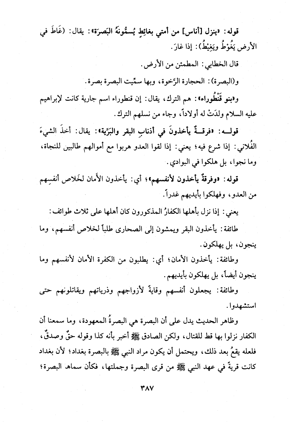 وظاهر الحديث يدل على أن البصرة هي البصرةُ المعهودة، وما سمعنا أن الكفار نزلوا بها قط للقتال، ولكن الصادق - صلى الله عليه وسلم - أخبر بأنه كذا وقوله حقٌ وصدقٌ، فلعله يقعُ بعد ذلك، ويحتمل أن يكون مراد النبي - صلى الله عليه وسلم - بالبصرة بغداد؛ لأن بغداد كانت قريةً في عهد النبي - صلى الله عليه وسلم - من قرى البصرة وجملتها، فكأن سماها البصرة؛