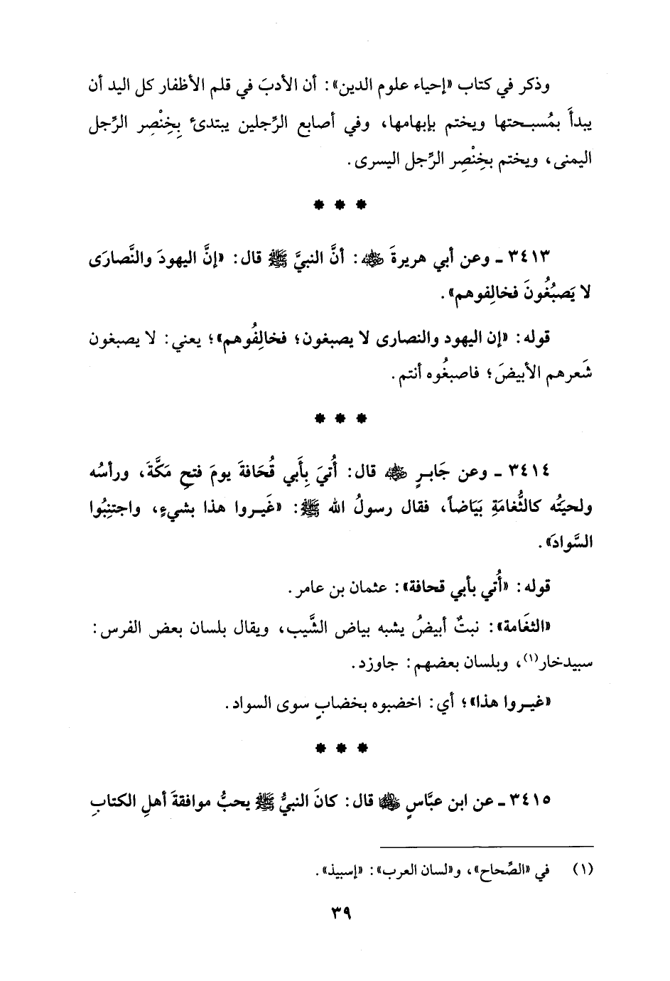 3413 - وعن أبي هريرةَ - رضي الله عنه -: أنَّ النبيَّ - صلى الله عليه وسلم - قال: "إنَّ اليهودَ والنَّصارَى لا يَصبُغُونَ فخالِفوهم".