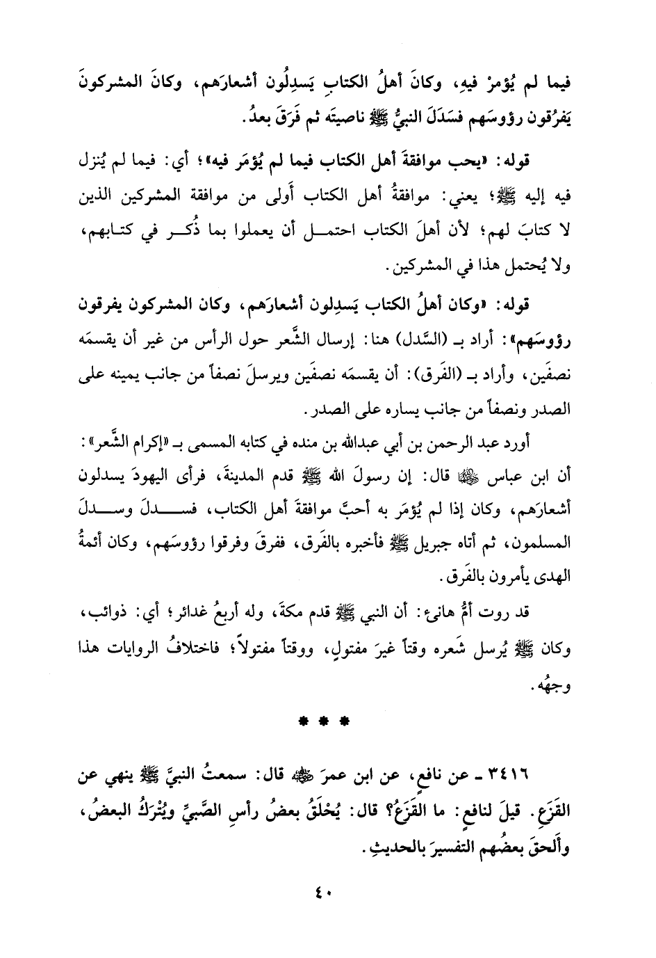 قوله: "وكان أهلُ الكتاب يَسدِلون أشعارَهم، وكان المشركون يفرقون رؤوسَهم": أراد بـ (السَّدل) هنا: إرسال الشَّعر حول الرأس من غير أن يقسمَه نصفَين، وأراد بـ (الفَرق): أن يقسمَه نصفَين ويرسلَ نصفًا من جانب يمينه على الصدر ونصفًا من جانب يساره على الصدر.