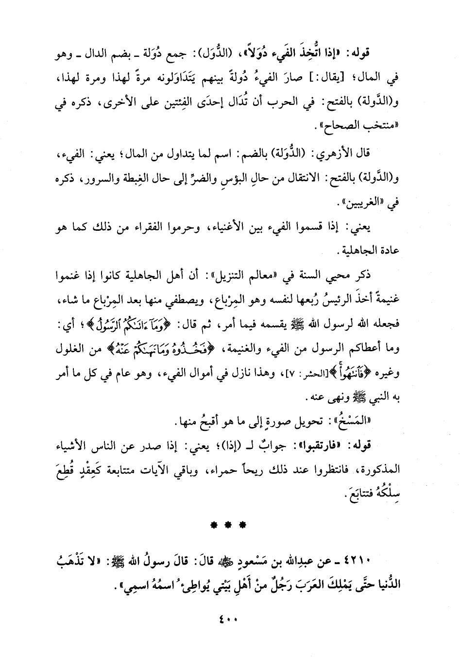 4210 - عن عبدِ الله بن مَسْعودٍ - رضي الله عنه - قالَ: قالَ رسولُ الله - صلى الله عليه وسلم -: "لا تَذْهَبُ الدُّنيا حتَّى يَمْلِكَ العَرَبَ رَجُلٌ منْ أَهْلِ بَيْتي يُواطِئُ اسمُهُ اسمِي".
