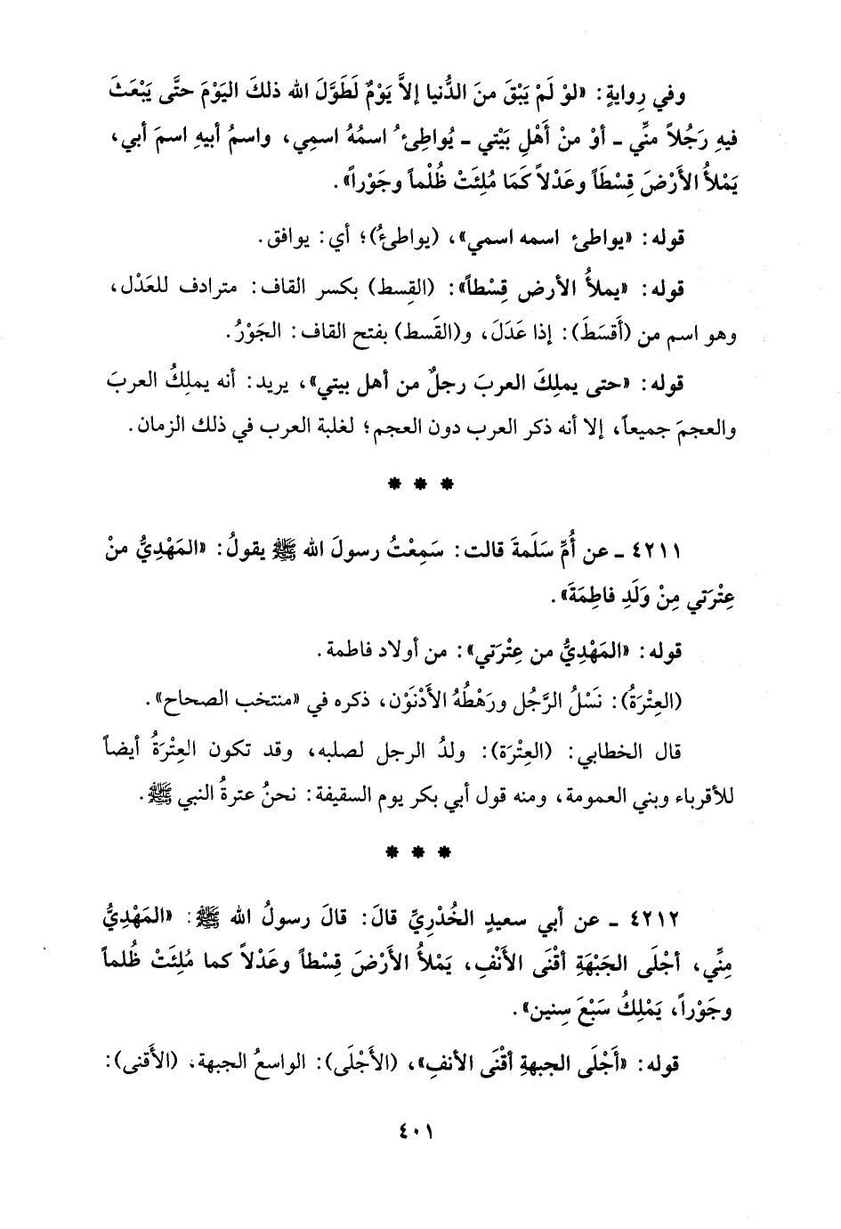 قوله: "يملأُ الأرض قِسْطًا": (القِسط) بكسر القاف: مترادف للعَدْل، وهو اسم من (أَقسَطَ): إذا عَدَلَ، و (القَسط) بفتح القاف: الجَوْرُ.
