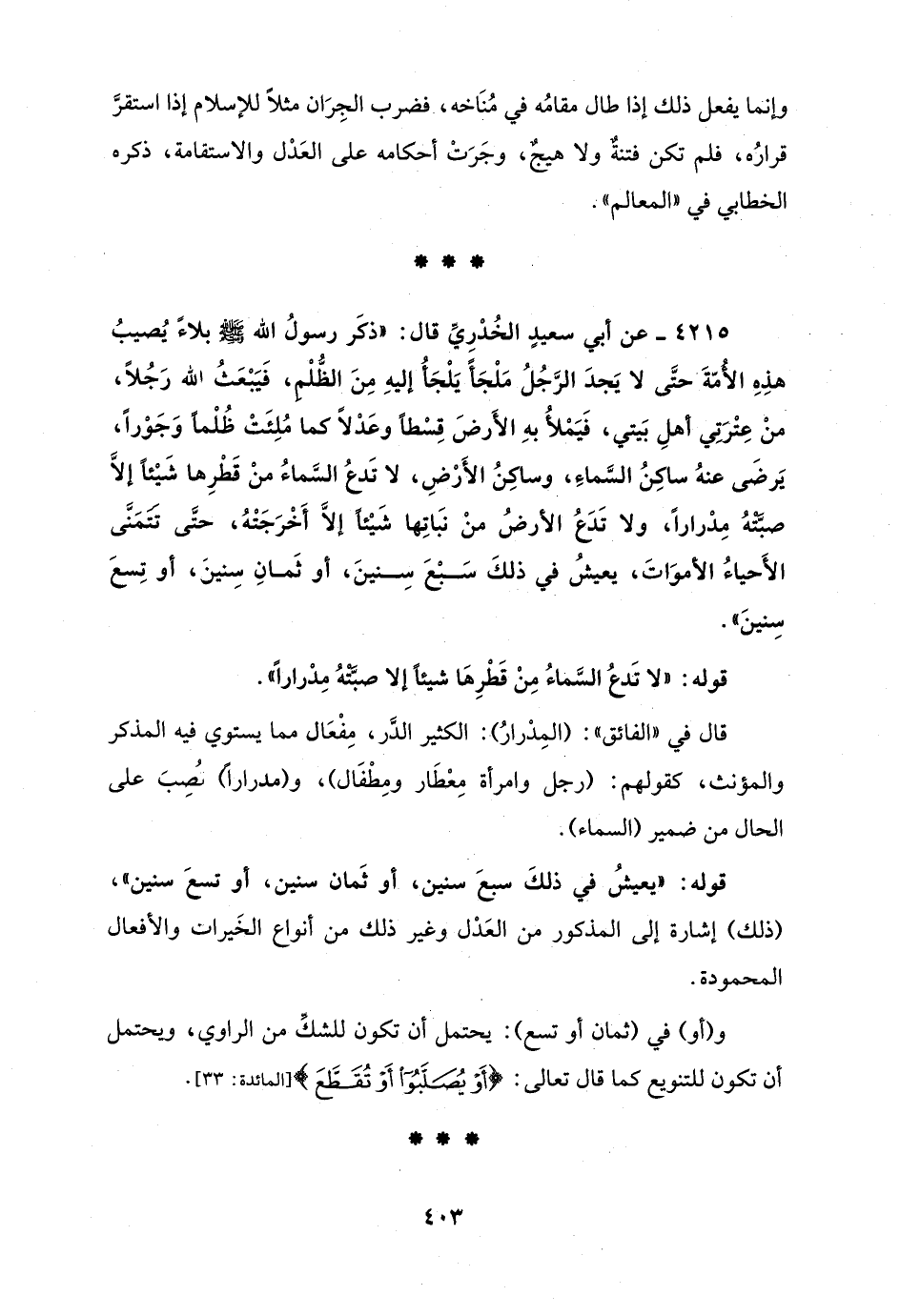 4215 - عن أبي سعيدٍ الخُدْرِيِّ قال: "ذكَر رسولُ الله - صلى الله عليه وسلم - بلاءً يُصيبُ هذِهِ الأُمّةَ حتَّى لا يَجدَ الرَّجُلُ مَلْجَأً يَلْجَأُ إليهِ مِنَ الظُّلْمِ، فَيَبْعَثُ الله رَجُلاً، منْ عِتْرَتِي أهلِ بَيتي، فَيَمْلأُ بهِ الأَرضَ قِسْطًا وعَدْلًا كما مُلِئَتْ ظُلْمًا وَجَوْرًا، يَرضَى عنهُ ساكِنُ السَّماءِ، وساكِنُ الأَرْضِ، لا تَدعُ السَّماءُ منْ قَطْرِها شَيْئًا إلَّا صبَّتْهُ مِدْرارًا، ولا تَدَعُ الأرضُ منْ نَباتِها شَيْئًا إلاَّ أَخْرَجَتْهُ، حتَّى تَتَمَنَّى الأَحياءُ الأموَاتَ، يعيشُ في ذلكَ سَبْعَ سِنينَ، أو ثَمانِ سِنينَ، أو تِسعَ سِنينَ".
