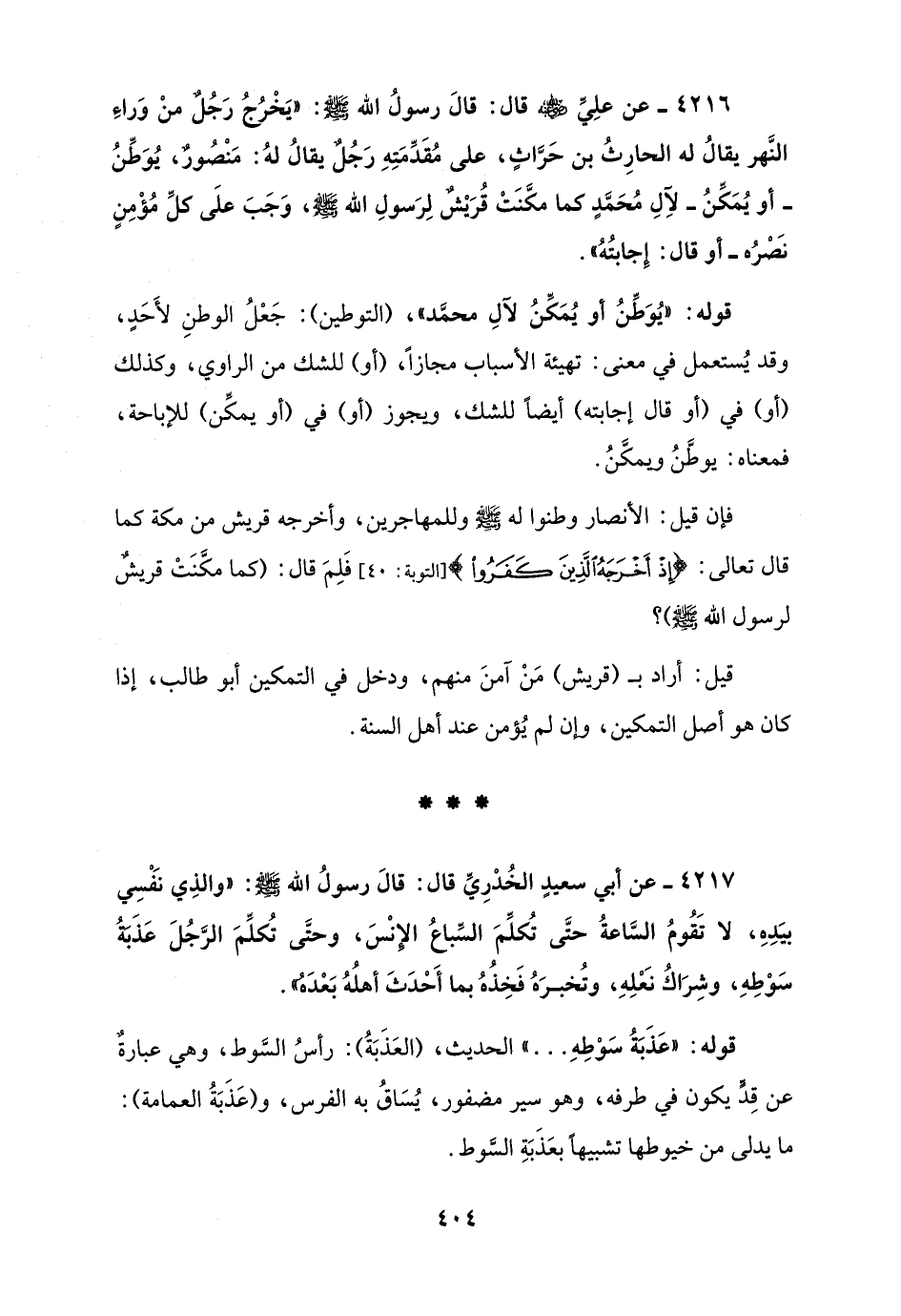 4216 - عن علِيِّ - رضي الله عنه - قال: قالَ رسولُ الله - صلى الله عليه وسلم - "يَخْرُجُ رَجُلٌ منْ وَراءِ النَّهر يقالُ له الحارِثُ بن حَرَّاثٍ، على مُقَدِّمَتِهِ رَجُل يقالُ لهُ: مَنْصُور، يُوَطِّنُ - أو يُمَكِّنُ - لآلِ مُحَمَّدٍ كما مكَّنَتْ قُرَيْشٌ لِرَسولِ الله - صلى الله عليه وسلم -، وَجَبَ علَى كلِّ مُؤْمِنٍ نَصْرُه - أو قال: إِجابتُهُ".