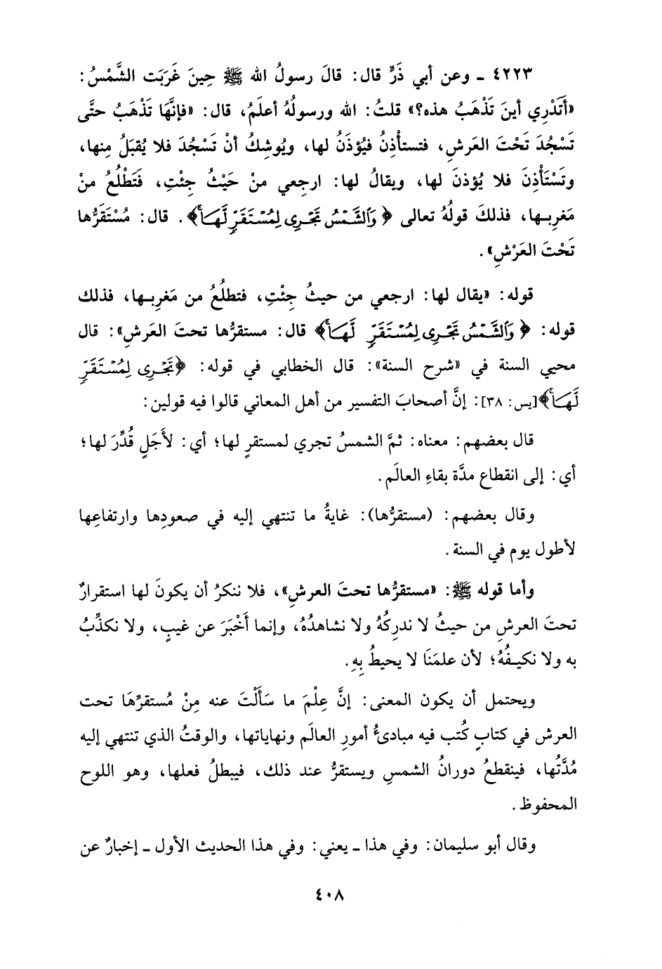 4223 - وعن أبي ذَرًّ قال: قالَ رسولُ الله - صلى الله عليه وسلم - حِينَ غرَبَت الشَّمْسُ: "أَتَدْرِي أينَ تَذْهَبُ هذه؟ " قلتُ: الله ورسولُهُ أعلَمُ، قال: "فإنَّهَا تَذْهَبُ حتَّى تَسْجُدَ تَحْتَ العَرشِ، فتستأْذِنُ فيُؤذَنُ لها، ويُوشِكُ أنْ تَسْجُدَ فلا يُقبَلُ مِنها، وتَسْتَأْذِنَ فلا يُؤذنَ لها، ويقالُ لها: ارجِعي منْ حَيْثُ جِئْتِ، فَتَطْلُعُ منْ مَغرِبها، فذلكَ قولُهُ تعالى {وَالشَّمْسُ تَجْرِي لِمُسْتَقَرٍّ لَهَا}. قال: مُسْتَقَرُّها تَحْتَ العَرْشِ".
