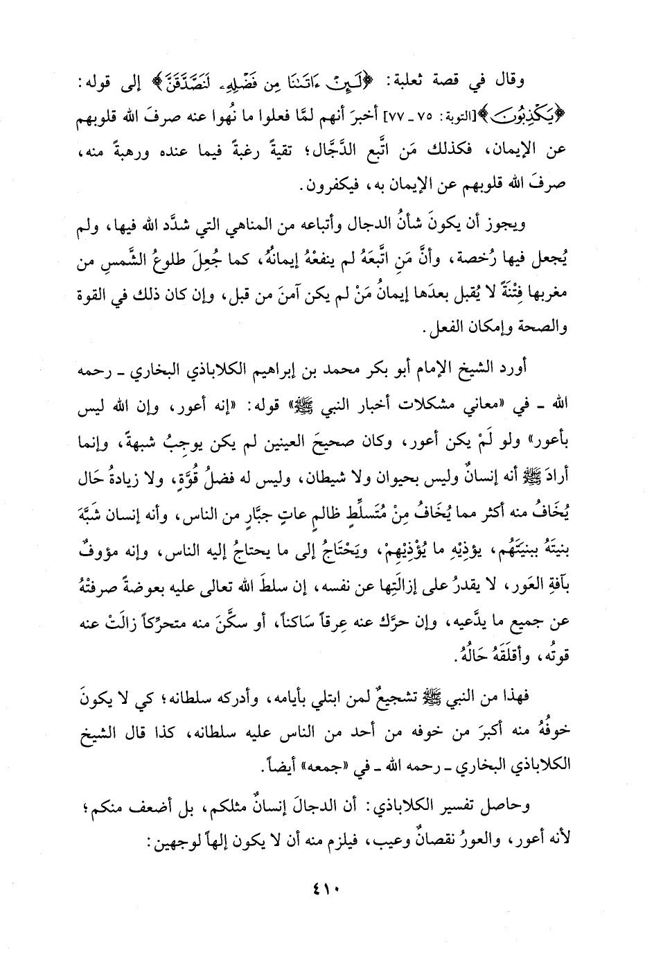 وحاصل تفسير الكلاباذي: أن الدجالَ إنسانٌ مثلكم، بل أضعف منكم؛ لأنه أعور، والعورُ نقصانٌ وعيب، فيلزم منه أن لا يكون إلهًا لوجهين: