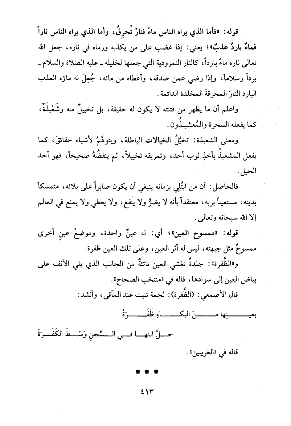 واعلم أن ما يظهر من فتنته لا يكون له حقيقة، بل تخييلٌ منه وشَعْبذَةٌ، كما يفعله السحرة والمُعشبذُون.