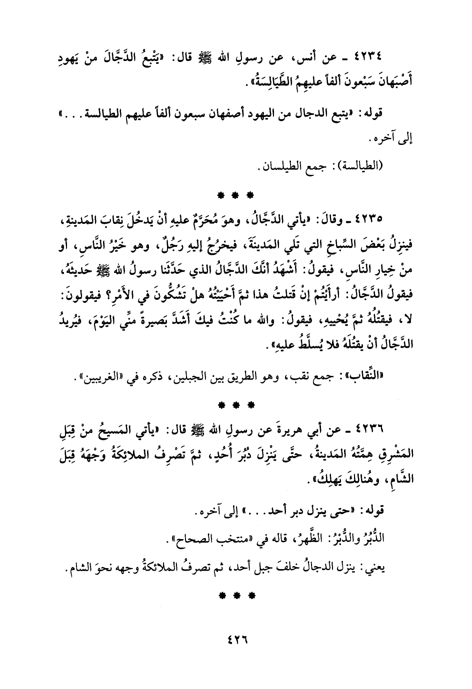 4236 - عن أبي هريرةَ عن رسولِ الله - صلى الله عليه وسلم - قال: "يأتي المَسيحُ منْ قِبَلِ المَشْرِقِ هِمَّتُهُ المَدينةُ، حتَّى يَنْزِلَ دُبُرَ أُحُدٍ، ثمَّ تَصْرِفُ الملائِكَةُ وَجْهَهُ قِبَلَ الشَّامِ، وهُنالِكَ يَهلِكُ".