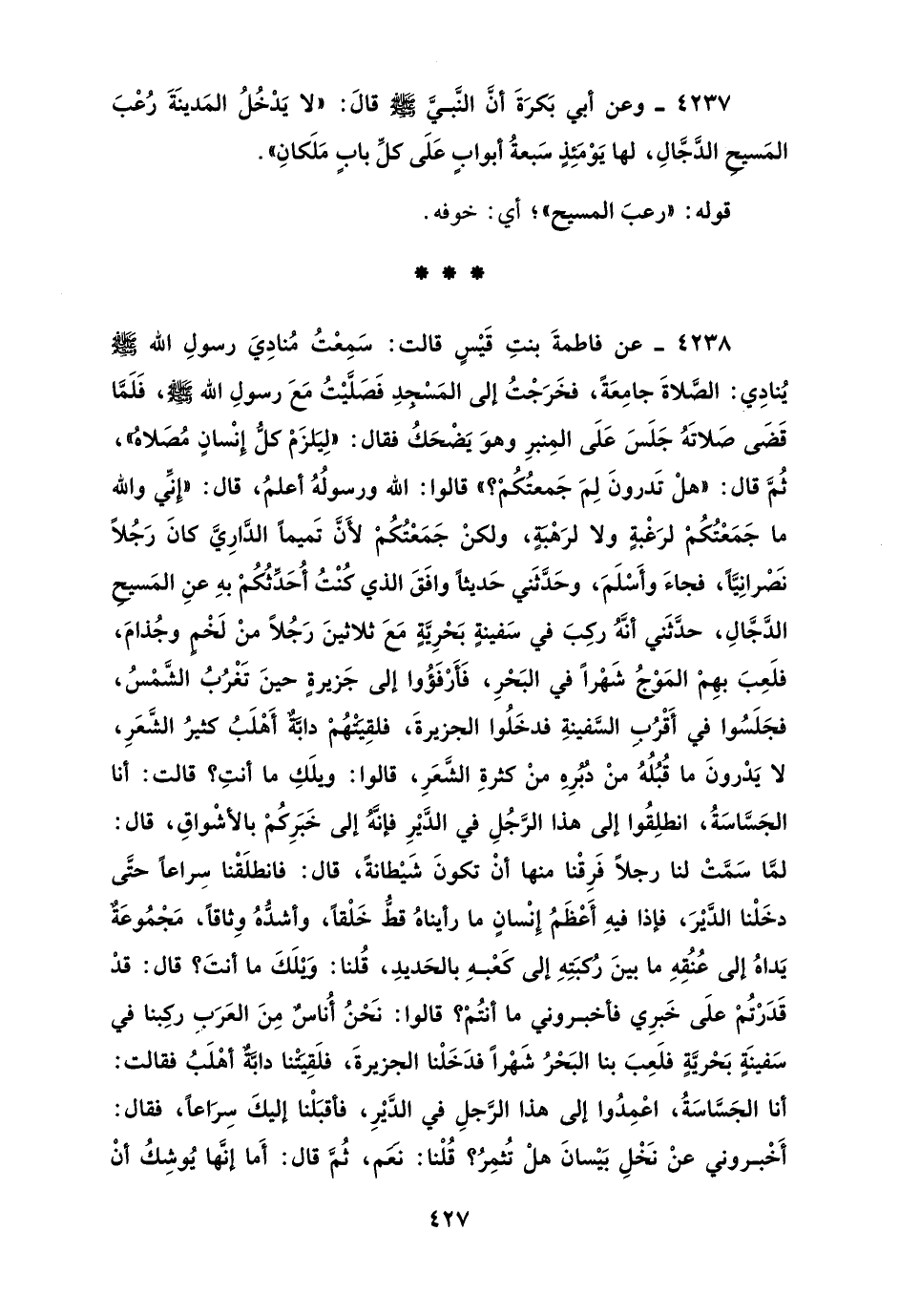 4238 - عن فاطمةَ بنتِ قَيْسٍ قالت: سَمِعْتُ مُنادِيَ رسولِ الله - صلى الله عليه وسلم - يُنادِي: الصَّلاةَ جامِعَةً، فخَرَجْتُ إلى المَسْجِدِ فَصَلَّيْتُ مَعَ رسولِ الله - صلى الله عليه وسلم -، فَلَمَّا قَضَى صَلاتَهُ جَلَسَ عَلَى المِنبرِ وهوَ يَضْحَكُ فقال: "لِيَلزَم كلُّ إنْسانٍ مُصَلاهُ"، ثُمَّ قال: "هلْ تَدرونَ لِمَ جَمعتُكُمْ؟ " قالوا: الله ورسولُهُ أعلمُ، قال: "إِنَّي والله ما جَمَعْتُكُم لرَغْبةٍ ولا لرَهْبَةٍ، ولكنْ جَمَعتُكُمْ لأَنَّ تَميمًا الدَّارِيَّ كانَ رَجُلاً نَصْرانِيًّا، فجاءَ وأَسْلَمَ، وحَدَّثَني حَديثًا وافَقَ الذي كُنْتُ أُحَدِّثُكُم بهِ عنِ المَسيحِ الدَّجَّالِ، حدَّثَني أنَّهُ ركِبَ في سَفينةٍ بَحْرِيَّةٍ مَعَ ثلاثينَ رَجُلًا منْ لَخْمٍ وجُذامَ، فلَعِبَ بهم المَوْجُ شَهْرًا في البَحْرِ، فَأَرْفَؤُوا إلى جَزيرةٍ حينَ تَغْرُبُ الشَّمْسُ، فجَلَسُوا في أَقْرُبِ السَّفينةِ فدخَلُوا الجزيرةَ، فلقِيَتهُمْ دابَّةٌ أَهْلَبُ كثيرُ الشَّعَرِ، لا يَدْرونَ ما قُبُلُهُ منْ دُبُرِهِ منْ كثرةِ الشَّعَرِ، قالوا: ويلَكِ ما أنتِ؟ قالت: أنا الجَسَّاسَةُ، انطلِقُوا إلى هذا الرَّجُلِ في الدَّيْرِ فإنَّهُ إلى خَبَرِكُمْ بالأشْواقِ، قال: لمَّا سَمَّتْ لنا رجلًا فَرِقْنا منها أنْ تكونَ شَيطانةً، قال: فانطلَقْنا سِراعًا حتَّى دخَلْنا الدَّيْرَ، فإذا فيهِ أَعْظَمُ إِنْسانٍ ما رأيناهُ قطُّ خَلْقًا، وأشدُّهُ وِثاقًا، مَجْمُوعَةٌ يَداهُ إلى عُنُقِهِ ما بينَ رُكبَتِهِ إلى كَعْبهِ بالحَديدِ، قُلنا: وَيْلَكَ ما أنتَ؟ قال: قدْ قَدَرْتُمْ علَى خَبرِي فأخبروني ما أنتُمْ؟ قالوا: نَحْنُ أُناسٌ مِنَ العَرَبِ ركِبنا في سَفينَةٍ بَحْريَّةٍ فلَعِبَ بنا البَحرُ شَهْرًا فدَخَلْنا الجزيرةَ، فلَقِيَتْنا دابَّةٌ أهْلَبُ فقالت: أنا الجَسَّاسَةُ، اعْمِدُوا إلى هذا الرَّجلِ في الدَّيْرِ، فأقبَلْنا إليكَ سِرَاعًا، فقال: أَخْبروني عنْ نَخْلِ بَيْسانَ هلْ تُثمِرُ؟ قُلْنا: نَعَم، ثُمَّ قال: أَما إنَّها يُوشِكُ أنْ