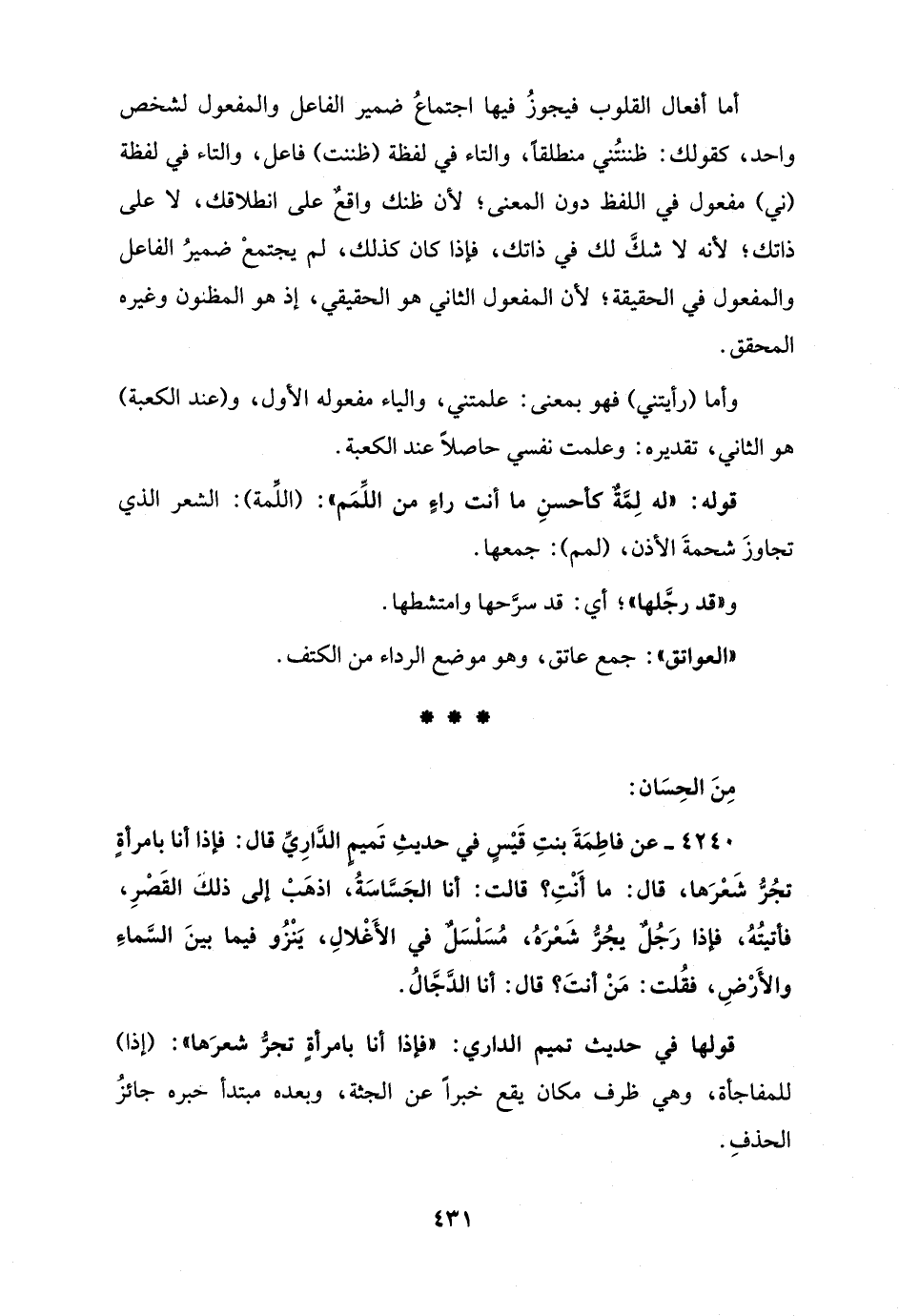 قولها في حديث تميم الداري: "فإذا أنا بامرأةٍ تجرُّ شعرَها": (إذا) للمفاجأة، وهي ظرف مكان يقع خبرًا عن الجثة، وبعده مبتدأ خبره جائزُ الحذفِ.