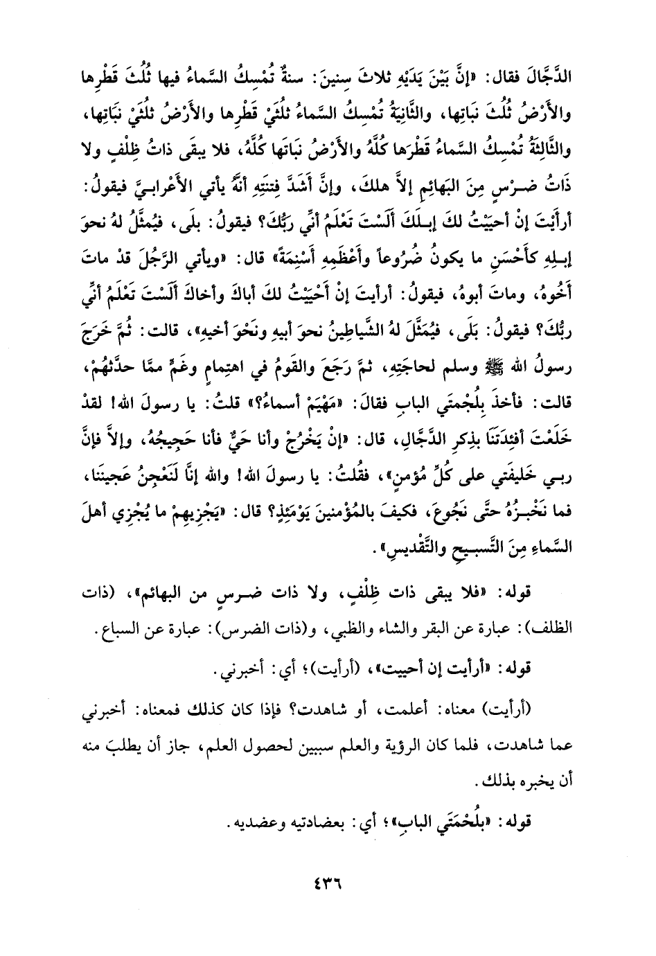 الدَّجَّالَ فقال: "إنَّ بَيْنَ يَدَيْهِ ثلاثَ سِنينَ: سنةٌ تُمْسِكُ السَّماءُ فيها ثُلُثَ قَطْرِها والأَرْضُ ثُلُثَ نبَاتِها، والثَّانِيةُ تُمْسِكُ السَّماءُ ثلُثَيْ قَطْرِها والأَرْضُ ثلُثَيْ نبَاتِها، والثَّالِثَةُ تُمْسِكُ السَّماءُ قَطْرَها كُلَّهُ والأَرْضُ نبَاتَها كُلَّهُ، فلا يبقَى ذاتُ ظِلْفٍ ولا ذَاتُ ضرْسٍ مِنَ البَهائِمِ إلَّا هلكَ، وإنَّ أَشَدَّ فِتنَتِهِ أنَّهُ يأتي الأَعْرابيَّ فيقولُ: أرأَيْتَ إنْ أحيَيْتُ لكَ إبلَكَ أَلَسْتَ تَعْلَمُ أنِّي رَبُّكَ؟ فيقولُ: بلَى، فيُمثَّلُ لهُ نحوَ إبلِهِ كأَحْسَنِ ما يكونُ ضُرُوعًا وأَعْظَمِهِ أَسْنِمَةً" قال: "ويأتي الرَّجُلَ قدْ ماتَ أَخُوهُ، وماتَ أبوهُ، فيقولُ: أرأيتَ إنْ أَحْيَيْتُ لكَ أباكَ وأخاكَ ألسْتَ تَعْلَمُ أنِّي ربُّكَ؟ فيقولُ: بَلَى، فيُمَثَّلَ لهُ الشَّياطِينُ نحوَ أبيهِ ونَحْوَ أخيهِ"، قالت: ثُمَّ خَرَجَ رسولُ الله - صلى الله عليه وسلم - وسلم لحاجَتِهِ، ثمَّ رَجَعَ والقَومُ في اهتِمامٍ وغَمٍّ ممَّا حدَّثهُمْ، قالت: فأخذَ بِلُجْمتَي البابِ فقالَ: "مَهْيَمْ أسماءُ؟ " قلتُ: يا رسولَ الله! لقدْ خَلَعْتَ أفئِدَتَنَا بذِكرِ الدَّجَّالِ، قال: "إنْ يَخْرُجْ وأنا حَيٌّ فأنا حَجِيجُهُ، وإلَّا فإنَّ ربي خَليفَتي على كُلِّ مُؤمنٍ"، فقُلتُ: يا رسولَ الله! والله إنَّا لَنَعْجنُ عَجينَنا، فما نَخْبزُهُ حتَّى نَجُوعَ، فكيفَ بالمُؤْمنينَ يَوْمَئِذٍ؟ قال: "يَجْزِيهِمْ ما يُجْزِي أهلَ السَّماءِ مِنَ التَّسبيح والتَّقْديسِ".