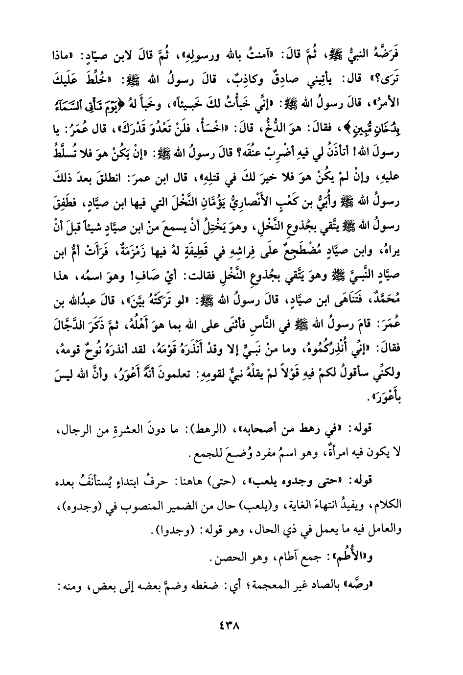 فَرَضَّهُ النبيُّ - صلى الله عليه وسلم -، ثُمَّ قالَ: "آمنتُ بالله ورسولِهِ"، ثُمَّ قالَ لابن صيّادٍ: "ماذا تَرَى؟ " قال: يأتِيني صادِقٌ وكاذِبٌ، قالَ رسولُ الله - صلى الله عليه وسلم -: "خُلِّطَ عَلَيكَ الأمرُ"، قالَ رسولُ الله - صلى الله عليه وسلم -: "إنِّي خَبأْتُ لكَ خَبيئًا"، وخَبأَ لهُ {يَوْمَ تَأْتِي السَّمَاءُ بِدُخَانٍ مُبِينٍ}، فقالَ: هوَ الدُّخُّ، قالَ: "اخْسَأْ، فلَنْ تَعْدُوَ قَدْرَكَ"، قال عُمَرُ: يا رسولَ الله! أتأذَنُ لي فيهِ أضْرِبْ عنُقَه؟ قالَ رسولُ الله - صلى الله عليه وسلم -: "إنْ يَكُنْ هوَ فلا تُسلَّطُ عليهِ، وإنْ لمْ يكُنْ هوَ فلا خيرَ لكَ في قتلِهِ"، قال ابن عمرَ: انطلقَ بعدَ ذلكَ رسولُ الله - صلى الله عليه وسلم - وأُبَيُّ بن كَعْبٍ الأَنْصارِيُّ يَؤُمَّانِ النَّخْلَ التي فيها ابن صيَّادٍ، فطَفِقَ رسولُ الله - صلى الله عليه وسلم - يتَّقي بجُذوعِ النَّخْلِ، وهوَ يَخْتِلُ أنْ يسمعَ منْ ابن صيَّادٍ شيئًا قبلَ أنْ يراهُ، وابن صيَّادٍ مُضْطَجِعٌ علَى فِراشِهِ في قَطِيفَةٍ لهُ فيها زَمْزَمَةٌ، فَرَأَتْ أمُّ ابن صيَّادٍ النَّبيَّ - صلى الله عليه وسلم - وهوَ يتَّقي بجُذوعِ النَّخْلِ فقالت: أيْ صَافِ! وهوَ اسمُه، هذا مُحَمَّدٌ، فَتَنَاهَى ابن صيَّادٍ، قالَ رسولُ الله - صلى الله عليه وسلم -: "لو تَرَكَتْهُ بيَّنَ"، قالَ عبدُ الله بن عُمَرَ: قامَ رسولُ الله - صلى الله عليه وسلم - في النَّاس فأثنَى على الله بما هوَ أَهْلُهُ، ثمَّ ذَكَرَ الدَّجَّالَ فقالَ: "إنِّي أُنْذِرُكُمُوهُ، وما منْ نبَيٍّ إلا وقدْ أَنْذَرَهُ قَوْمَهُ، لقد أنذرَهُ نُوحٌ قومهُ، ولكنِّي سأقولُ لكمْ فيهِ قَوْلًا لمْ يقلْهُ نبيٌّ لقومِهِ: تعلمونَ أنَّهُ أَعْوَرُ، وأنَّ الله ليسَ بأَعْوَرَ".