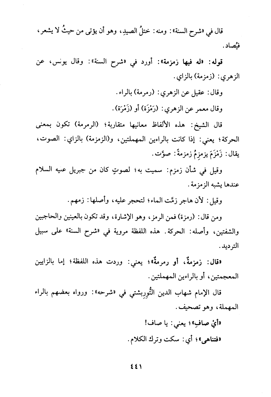 قال الشيخ: هذه الألفاظ معانيها متقاربة؛ (الرمرمة) تكون بمعنى الحركة؛ يعني: إذا كانت بالراءين المهملتين، و (الزمزمة) بالزاي: الصوت، يقال: زَمْزَمَ يزمزِمُ زمزمةً: صوَّت.