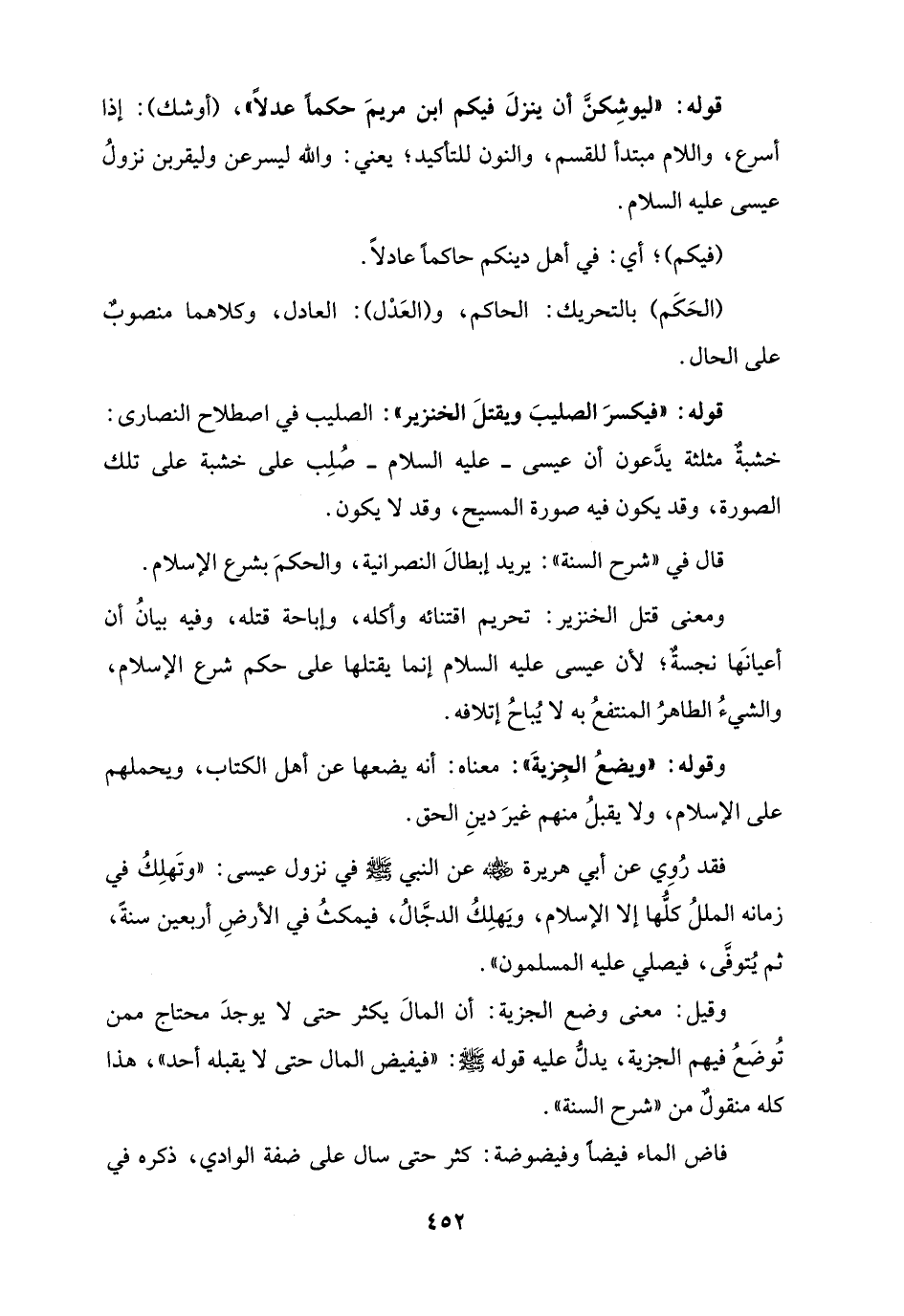 ومعنى قتل الخنزير: تحريم اقتنائه وأكله، وإباحة قتله، وفيه بيانُ أن أعيانَها نجسةٌ؛ لأن عيسى عليه السلام إنما يقتلها على حكم شرع الإسلام، والشيءُ الطاهرُ المنتفعُ به لا يُباحُ إتلافه.