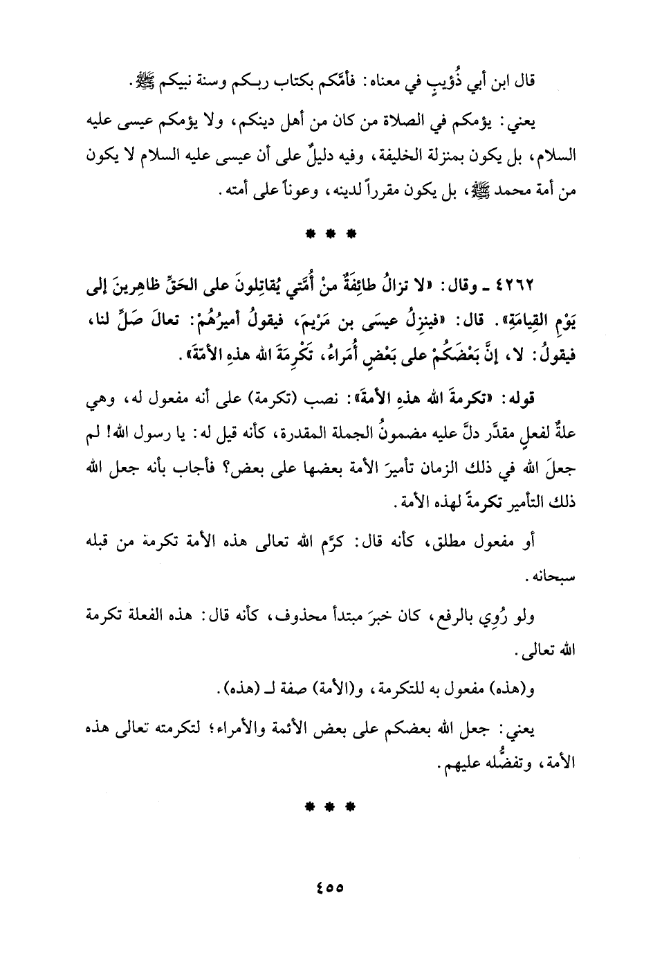4262 - وقال: "لا تزالُ طائِفَةٌ منْ أُمَّتي يُقاتِلونَ على الحَقِّ ظاهِرينَ إلى يَوْمِ القِيامَةِ". قال: "فينزِلُ عيسَى بن مَرْيمَ، فيقولُ أميرُهُمْ: تعالَ صَلِّ لنا، فيقولُ: لا، إنَّ بَعْضَكُمْ على بَعْضٍ أُمَراءُ، تَكْرِمَةَ الله هذهِ الأمّةَ".