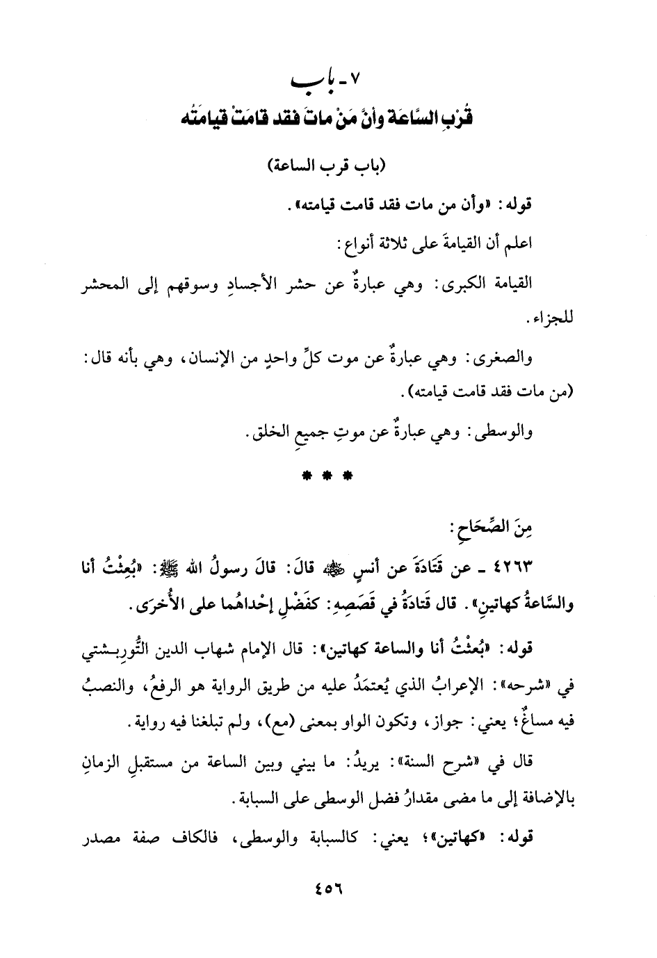 7 - باب قُرْبِ السَّاعَة وأنَّ مَنْ ماتَ فقد قامَتْ قيامَتُه