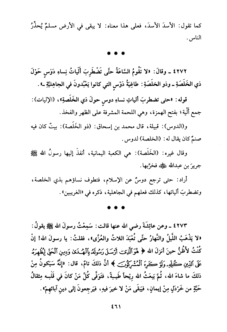 4272 - وقالَ: "لا تَقُومُ السَّاعَةُ حتَّى تَضْطَرِبَ أَلَياتُ نِساءِ دَوْسٍ حَوْلَ ذي الخَلَصَةِ - وذو الخلَصَةِ: طاغِيَةُ دَوْسٍ التي كانوا يَعْبُدونَ في الجاهِليَّةِ -".