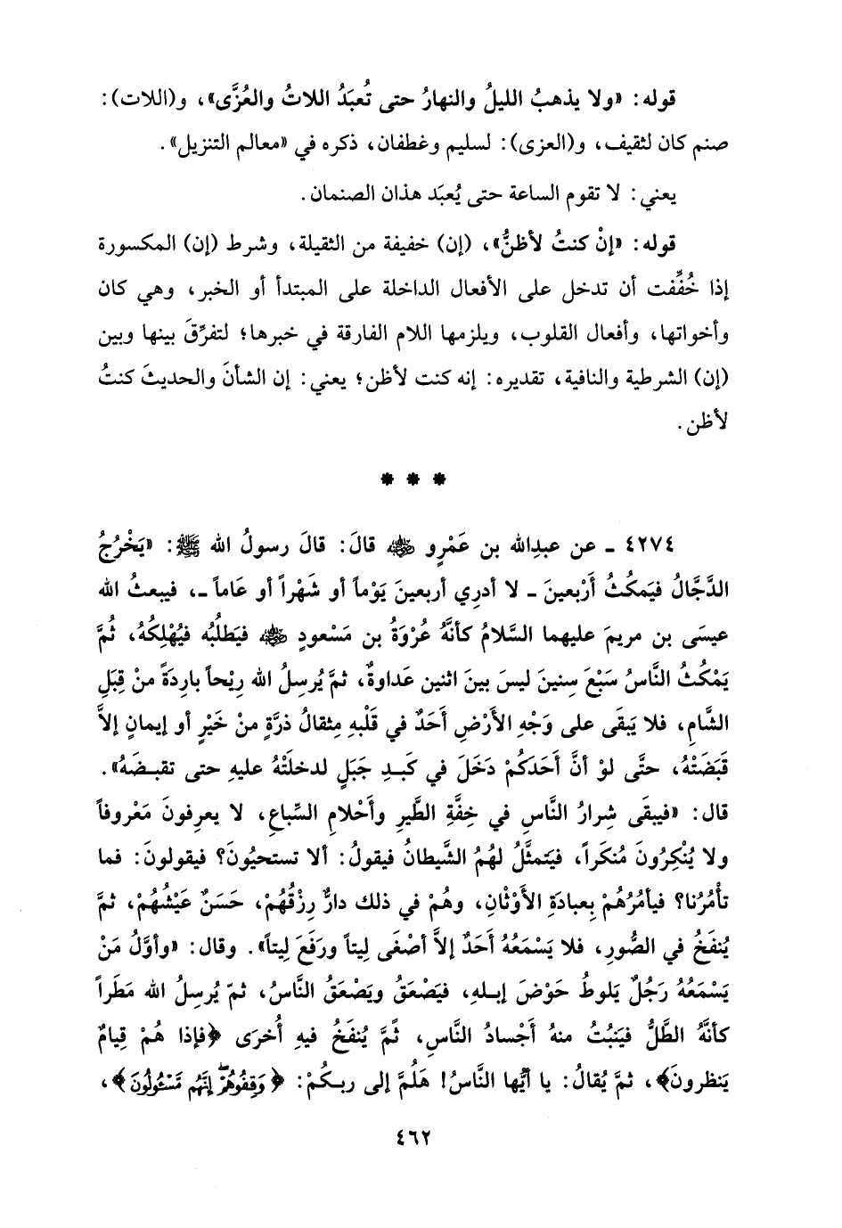 4274 - عن عبدِ الله بن عَمْرٍو - رضي الله عنه - قالَ: قالَ رسولُ الله - صلى الله عليه وسلم -: "يَخْرُجُ الدَّجَّالُ فيَمكُثُ أَرْبعينَ - لا أدرِي أربعينَ يَوْمًا أو شَهْرًا أو عَامًا -، فيبعثُ الله عيسَى بن مريمَ عليهما السَّلامُ كأنَّهُ عُرْوَةُ بن مَسْعودٍ - رضي الله عنه - فيَطلُبُه فيُهْلِكُهُ، ثُمَّ يَمْكُثُ النَّاسُ سَبْعَ سِنينَ ليسَ بينَ اثنين عَداوةٌ، ثمَّ يُرسِلُ الله رِيْحًا بارِدَةً منْ قِبَلِ الشَّامِ، فلا يَبقَى على وَجْهِ الأَرْضِ أَحَدٌ في قَلْبهِ مِثقالُ ذرَّةٍ منْ خَيْرٍ أو إيمانٍ إلَّا قَبَضَتْهُ، حتَّى لوْ أنَّ أَحَدَكُمْ دَخَلَ في كَبدِ جَبَلٍ لدخلَتْهُ عليهِ حتى تقبضَهُ". قال: "فيبقَى شِرارُ النَّاسِ في خِفَّةِ الطَّيرِ وأَحْلامِ السِّباعِ، لا يعرِفونَ مَعْروفًا ولا يُنْكِرُونَ مُنكَرًا، فيَتمثَّلُ لهُمُ الشَّيطانُ فيقولُ: ألا تستحيُونَ؟ فيقولونَ: فما تأْمُرُنا؟ فيأمُرُهُمْ بِعبادَةِ الأَوْثْانِ، وهُمْ في ذلك دارٌّ رِزقُهُمْ، حَسَنٌ عَيْشُهُمْ، ثمَّ يُنفَخُ في الصُّورِ، فلا يَسْمَعُهُ أَحَدٌ إلَّا أصغَى لِيتًا ورَفعَ لِيتًا". وقال: "وأوَّلُ مَنْ يَسْمَعُهُ رَجُلٌ يَلوطُ حَوْضَ إبلهِ، فيَصْعَقُ ويَصْعَقُ النَّاسُ، ثمّ يُرسِلُ الله مَطَرًا كأنَّهُ الطَّلُّ فيَنبُتُ منهُ أَجْسادُ النَّاسِ، ثمَّ يُنفَخُ فيهِ أُخرَى {فَإِذَا هُمْ قِيَامٌ يَنْظُرُونَ}، ثمَّ يُقالُ: يا أيُّها النَّاسُ! هَلُمَّ إلى ربكُمْ: {وَقِفُوهُمْ إِنَّهُمْ مَسْئُولُونَ}،