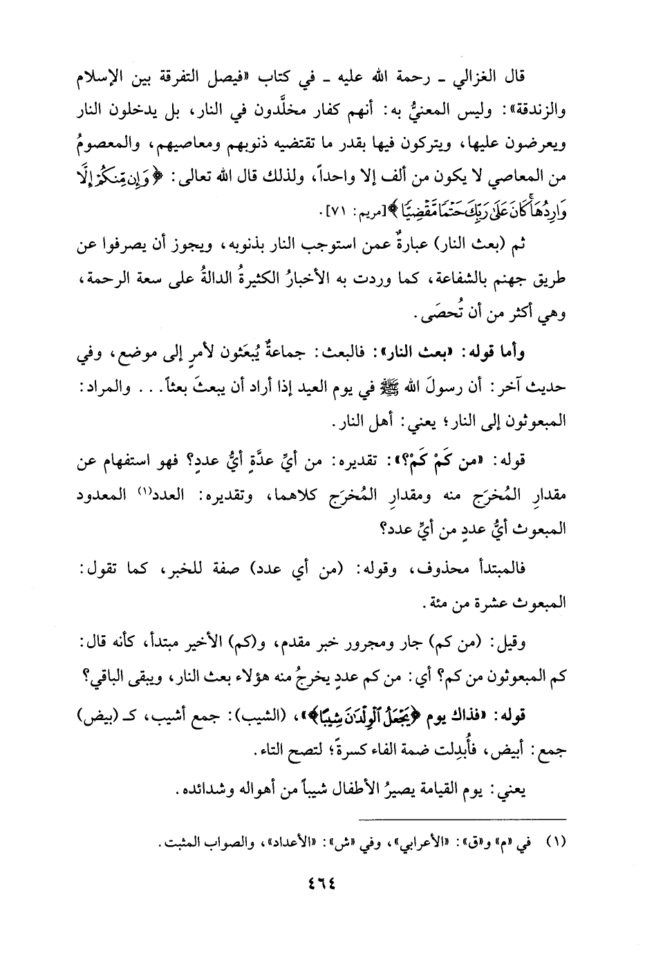 قال الغزالي - رحمة الله عليه - في كتاب "فيصل التفرقة بين الإسلام والزندقة": وليس المعنيُّ به: أنهم كفار مخلَّدون في النار، بل يدخلون النار ويعرضون عليها، ويتركون فيها بقدر ما تقتضيه ذنوبهم ومعاصيهم، والمعصومُ من المعاصي لا يكون من ألف إلا واحدًا، ولذلك قال الله تعالى: {وَإِنْ مِنْكُمْ إِلَّا وَارِدُهَا كَانَ عَلَى رَبِّكَ حَتْمًا مَقْضِيًّا} [مريم: 71].