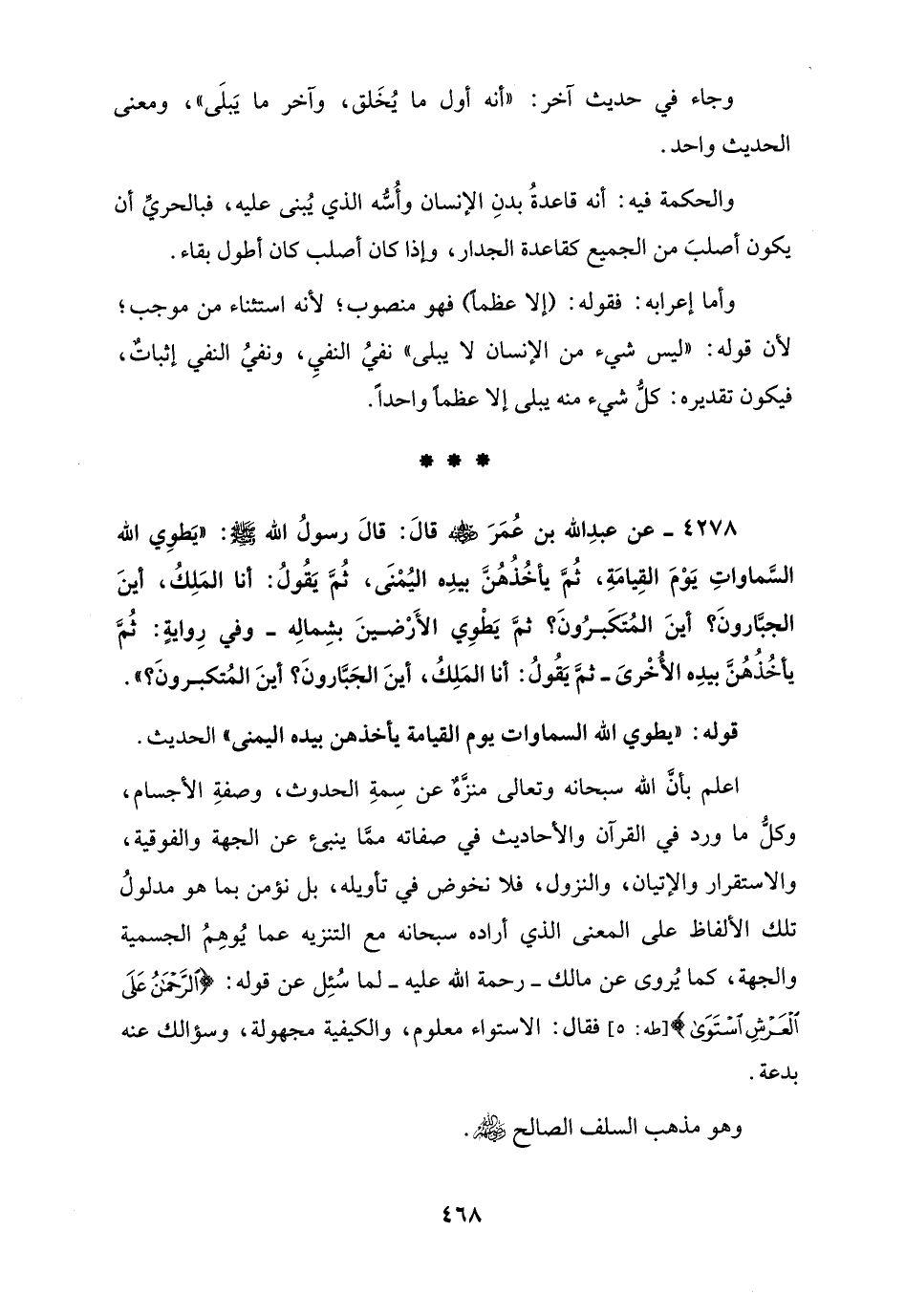 4278 - عن عبدِ الله بن عُمَرَ - رضي الله عنه - قالَ: قالَ رسولُ الله - صلى الله عليه وسلم -: "يَطوِي الله السَّماواتِ يَوْمَ القِيامَةِ، ثُمَّ يأخُذُهُنَّ بيدِه اليُمْنَى، ثُمَّ يَقُولُ: أنا المَلِكُ، أينَ الجبَّارونَ؟ أينَ المُتكَبرُونَ؟ ثمَّ يَطْوِي الأَرْضينَ بشِمالِه - وفي رِوايةٍ: ثُمَّ يأخُذُهُنَّ بيدِه الأُخْرىَ - ثمَّ يَقُولُ: أنا المَلِكُ، أينَ الجَبَّارونَ؟ أينَ المُتكبرونَ؟ ".
