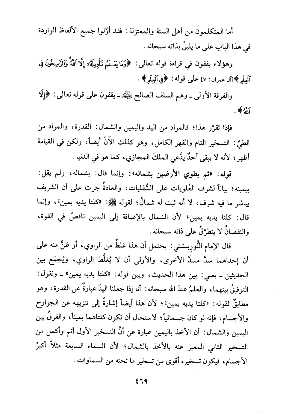 قال الإمام التُّورِبشتي: يحتمل أن هذا غلطٌ من الراوي، أو ظنٌّ منه على أن إحداهما سدَّ مسدَّ الأخرى، والأولى أن لا يُغلَّط الراوي، ويُجمَع بين الحديثين - يعني: بين هذا الحديث، وبين قوله: "كلتا يديه يمين" - ونقول: التوفيقُ بينهما، والعلمُ عندَ الله سبحانه: أنا إذا جعلنا اليدَ عبارةٌ عن القدرة، وهو مطابقٌ لقوله: "كلتا يديه يمين"؛ لأن هذا أيضًا إشارةٌ إلى تنزيهه عن الجوارح والأجسام، فإنه لو كان جسمانيًا؛ لاستحال أن تكون كلتاهما يمينًا، والفرقُ بين اليمين والشمال: أن الأخذ باليمين عبارة عن أنَّ التسخير الأول أتم وأكمل من التسخير الثاني المعبر عنه بالأخذ بالشمال؛ لأن السماء السابعة مثلًا أكبرُ الأجسام، فيكون تسخيره أقوى من تسخير ما تحته من السماوات.