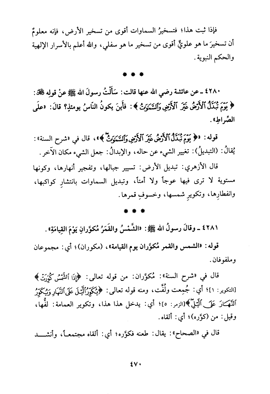 قوله: " {يَوْمَ تُبَدَّلُ الْأَرْضُ غَيْرَ الْأَرْضِ وَالسَّمَاوَاتُ} "، قال في "شرح السنة": يُقالُ: (التبديلُ): تغيير الشيء عن حاله، والإبدالُ: جعل الشيء مكان الآخر.