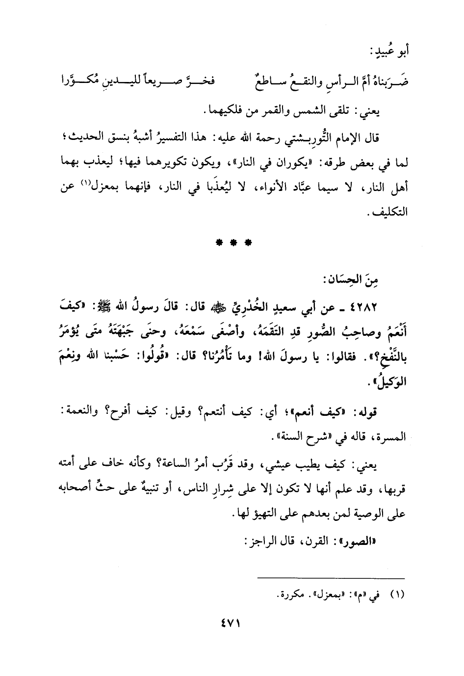 4282 - عن أبي سعيدٍ الخُدْرِيَّ - رضي الله عنه - قال: قالَ رسولُ الله - صلى الله عليه وسلم -: "كيفَ أَنْعَمُ وصاحِبُ الصُّورِ قدِ التَقَمَهُ، وأصْغَى سَمْعَهُ، وحنَى جَبْهَتَهُ متَى يُؤمَرُ بالنَّفْخِ؟ ". فقالوا: يا رسولَ الله! وما تَأْمُرُنا؟ قال: "قُولُوا: حَسْبنا الله ونِعْمَ الوَكيلُ".