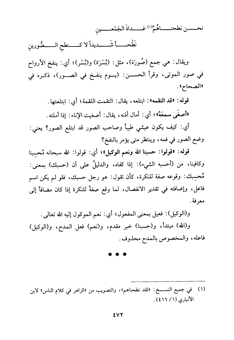 قوله: "قولوا: حسبنا الله ونعم الوكيل"؛ أي: قولوا: الله سبحانه مُحسِبنا وكافينا، من (أحسبه الشيء): إذا كفاه، والدليلُ على أن (حسبك) بمعنى: مُحسِبك: وقوعه صفة للنكرة، كأن تقول: هو رجل حسبك، فلو لم يكن اسم فاعل، وإضافته في تقدير الانفصال، لما وقع صفةً للنكرة إذا كان مضافًا إلى معرفة.