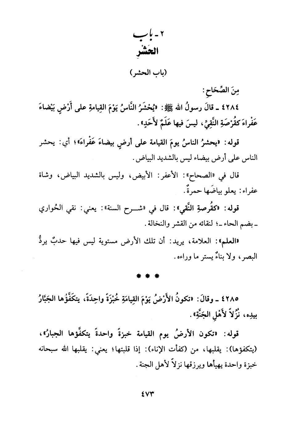 4284 - قالَ رسولُ الله - صلى الله عليه وسلم -: "يُحْشَرُ النَّاسُ يَوْمَ القِيامةِ على أَرْضٍ بَيْضاءَ عَفْراءَ كقُرْصَةِ النَّقِيِّ، ليسَ فيها عَلَمٌ لأَحَدٍ".