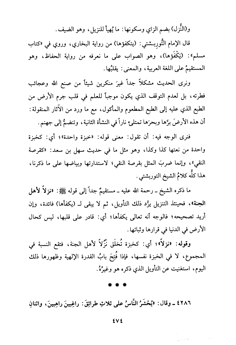 ما ذكره الشيخ - رحمة الله عليه - مستقيمٌ جدًا إلى قوله - صلى الله عليه وسلم -: "نزلًا لأهل الجنة"، فحينئذ التنزيل يرُّد ذلك التأويل، ثم لا يبقى لـ (يكفأها) فائدة، وإن أريد تصحيحه؛ فالوجه أنه تعالى يكفأها؛ أي: قادر على قلبها، ليس كحال الأرض في الدنيا في قرارها وثباتها.
