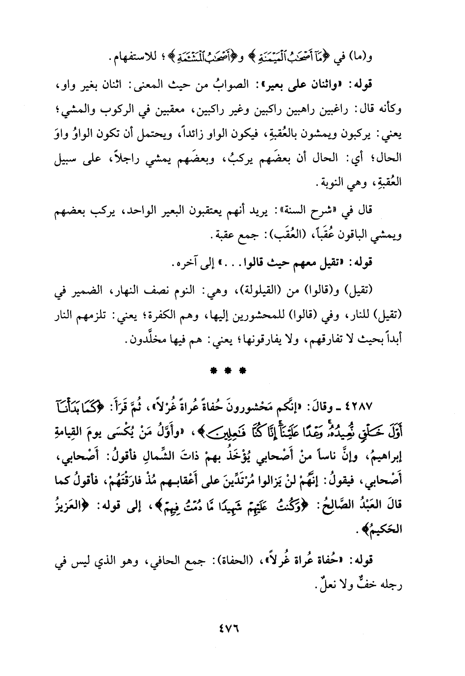 4287 - وقالَ: "إنَّكم مَحْشورونَ حُفاةً عُراةً غُرْلًا"، ثُمَّ قَرَأَ: {كَمَا بَدَأْنَا أَوَّلَ خَلْقٍ نُعِيدُهُ وَعْدًا عَلَيْنَا إِنَّا كُنَّا فَاعِلِينَ}، "وأَوَّلُ منْ يُكْسَى بومَ القِيامةِ إبراهيمُ، وإنَّ ناسًا منْ أَصْحابي يُؤْخَذُ بهمْ ذاتَ الشِّمالِ فأقولُ: أَصْحابي، أَصْحابي، فيقولُ: إنَّهُمْ لنْ يَزالوا مُرْتَدِّين على أَعْقابهم مُذْ فارَقْتَهُمْ، فأقولُ كما قالَ العَبْدُ الصَّالِحُ: {وَكُنْتُ عَلَيْهِمْ شَهِيدًا مَا دُمْتُ فِيهِمْ} , إلى قوله: {العَزيزُ الحَكيمُ}.