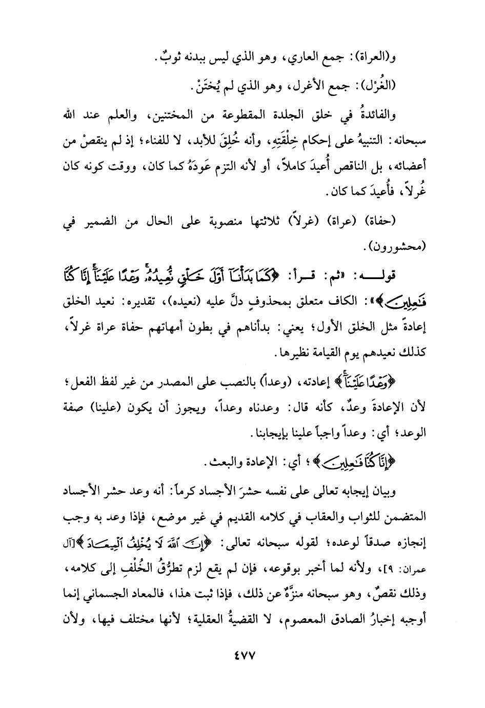 {وَعْدًا عَلَيْنَا} إعادته، (وعدًا) بالنصب على المصدر من غير لفظ الفعل؛ لأن الإعادةَ وعدٌ، كأنه قال: وعدناه وعدًا، ويجوز أن يكون (علينا) صفة الوعد؛ أي: وعدًا واجبًا علينا بإيجابنا.