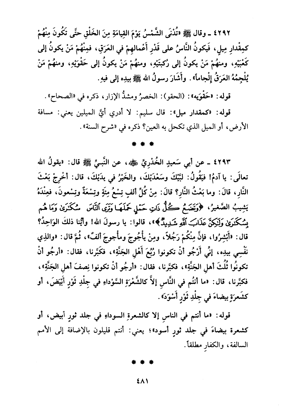 4292 - وقال - صلى الله عليه وسلم - "تُدْنىَ الشَّمْسُ يَوْمَ القِيامَةِ مِنَ الخَلْقِ حتَّى تَكُونَ مِنْهُمْ كمِقْدارِ مِيلٍ، فَيكونُ النَّاسُ على قَدْرِ أَعْمالهِمْ في العَرَقِ، فمِنْهُمْ مَنْ يكونُ إلى كَعْبَيْهِ، ومنهُمْ مَنْ يكونُ إلى رُكبتَيْهِ، ومنهُمْ مَنْ يكونُ إلى حَقْوَيْهِ، ومنهُمْ مَنْ يُلْجِمُهُ العَرَقُ إِلْجامًا". وأَشَارَ رسولُ الله - صلى الله عليه وسلم - بيدِه إلى فيهِ.