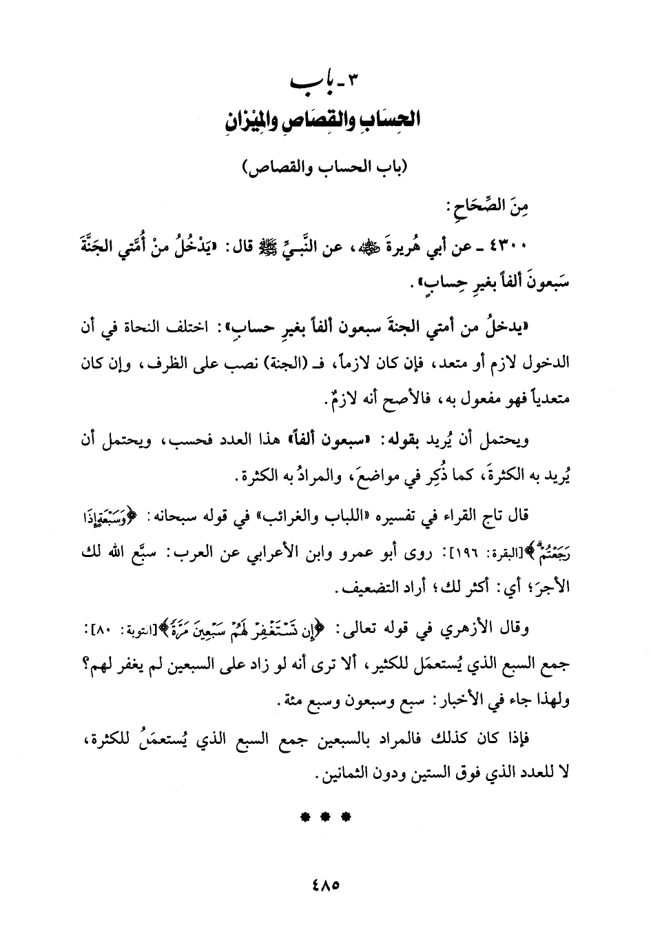 4300 - عن أبي هُريرةَ - رضي الله عنه -، عن النَّبيَّ - صلى الله عليه وسلم - قال: "يَدْخُلُ منْ أُمَّتي الجَنَّةَ سَبعونَ ألفًا بغيرِ حِسابٍ".
