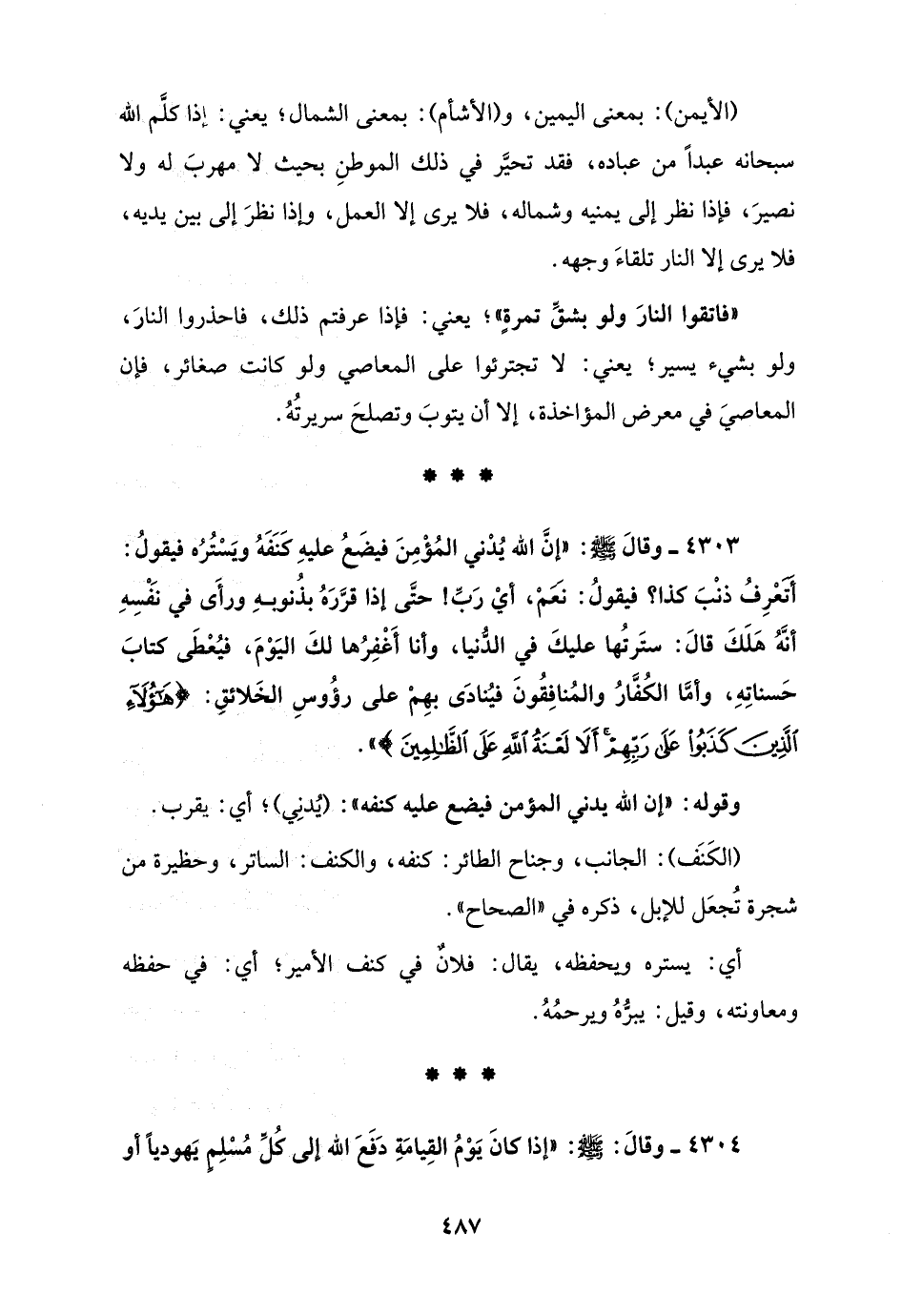 4303 - وقالَ - صلى الله عليه وسلم -: "إنَّ الله يُدْني المُؤْمِنَ فيضَعُ عليهِ كَنَفَهُ ويَسْتُرُه فيقولُ: أَتَعْرِفُ ذنْبَ كذا؟ فيقولُ: نَعَمْ، أيْ رَبِّ! حتَّى إذا قرَّرَهُ بذُنوبهِ ورأَى في نَفْسِهِ أنَّهُ هَلَكَ قالَ: ستَرتُها عليكَ في الدُّنيا، وأنا أَغْفِرُها لكَ اليَوْمَ، فيُعْطَى كتابَ حَسناتِهِ، وأمَّا الكُفَّارُ والمُنافِقُونَ فيُنادَى بهِمْ على رؤُوسِ الخَلائقِ: {هَؤُلَاءِ الَّذِينَ كَذَبُوا عَلَى رَبِّهِمْ أَلَا لَعْنَةُ اللَّهِ عَلَى الظَّالِمِينَ} ".