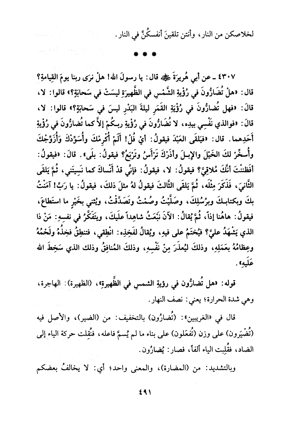 4307 - عن أبي هُريرَةَ - رضي الله عنه - قال: يا رسولَ الله! هلْ نرَى ربنا يومَ القِيامةِ؟ قال: "هلْ تُضَارُّونَ في رُؤْيةِ الشَّمْسِ في الظَّهيرَةِ ليسَتْ في سَحابَةٍ؟ " قالوا: لا، قالَ: "فهل تُضارُّونَ في رُؤْيَةِ القَمَرِ ليلةَ البَدْرِ ليسَ في سَحابَةٍ؟ " قالوا: لا، قالَ: "فوالذي نَفْسِي بيدِه، لا تُضَارُّونَ في رُؤْيةِ ربكُمْ إلَّا كما تُضارُّونَ في رُؤْيةِ أَحَدِهما. قال: "فيَلقَى العَبْدَ فيقولُ: أيْ فُلْ! أَلَمْ أُكْرِمْكَ وأُسَوِّدْكَ وَأُزَوِّجْكَ وأُسخِّرْ لكَ الخَيْلَ والإِبلَ وأذَرْكَ تَرْأَسُ وتَرْبَعُ؟ فيقولُ: بلَى". قالَ: "فيقولُ: أفَظننْتَ أنَّكَ مُلاقِيَّ؟ فيقولُ: لا، فيقولُ: فإنَّي قدْ أَنْساكَ كما نَسِيتَني، ثُمَ يَلقَى الثَّانيَ، فَذَكَرَ مِثْلَه، ثُمَّ يَلقَى الثَّالثَ فيقولُ لهُ مثلَ ذلكَ، فيقولُ: يا رَبِّ! آمَنْتُ بكَ وبكتابكَ وبرُسُلِكَ، وصَلَّيْتُ وصُمْتُ وتَصَدَّقْتُ، ويُثني بخَيْرٍ ما استَطاعَ، فيقولُ: ها هُنا إذًا، ثُمَّ يُقالُ: الآنَ نَبْعَثُ شاهِدًا علَيكَ، ويتَفَكَّرُ في نفسِهِ: مَنْ ذا الذي يَشْهَدُ عليَّ؟ فيُختَمُ على فيهِ، ويُقالُ لفَخِذِه: انْطِقي، فتنطِقُ فخِذُهُ ولَحْمُهُ وعِظامُهُ بعَمَلِهِ، وذلكَ ليُعذَرَ مِنْ نَفْسِهِ، وذلكَ المُنافِقُ وذلك الذي سَخِطَ الله عَلَيهِ".