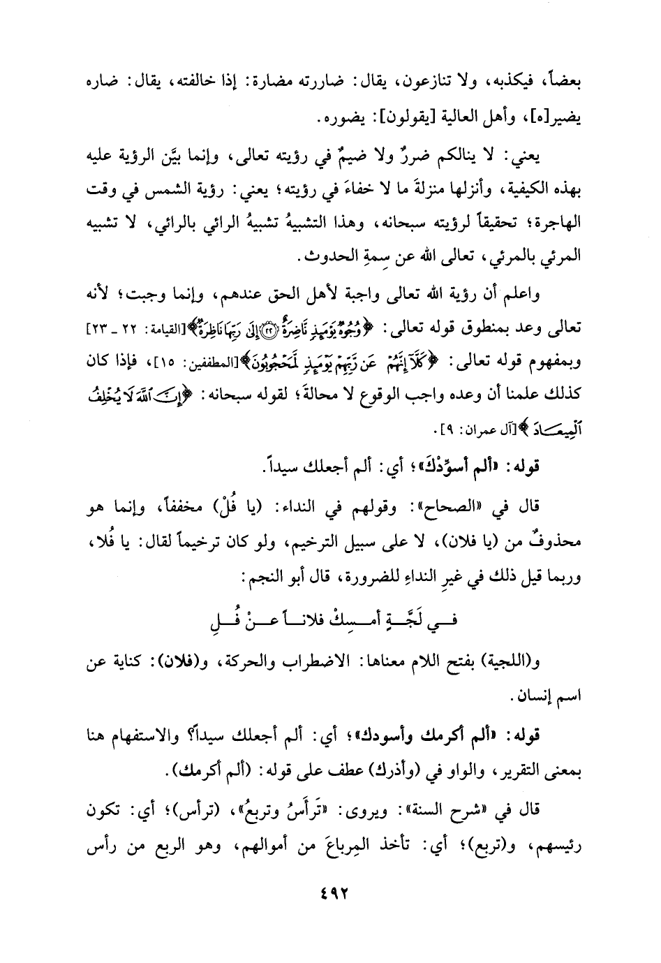 يعني: لا ينالكم ضررٌ ولا ضيمٌ في رؤيته تعالى، وإنما بيَّن الرؤية عليه بهذه الكيفية، وأنزلها منزلةَ ما لا خفاءَ في رؤيته؛ يعني: رؤية الشمس في وقت الهاجرة؛ تحقيقًا لرؤيته سبحانه، وهذا التشبيهُ تشبيهُ الرائي بالرائي، لا تشبيه المرئي بالمرئي، تعالى الله عن سِمةِ الحدوث.