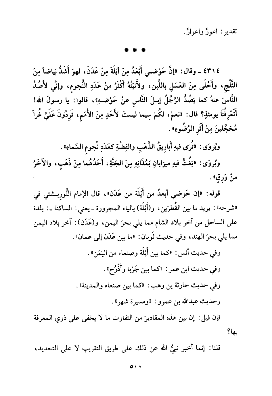 قوله: "إن حَوضي أبعدُ من أَيْلَة من عَدَن"، قال الإمام التُّورِبشتي في "شرحه": يريد ما بين القُطرَين، و (أَيْلَة) بالياء المجرورة - يعني: الساكنة -: بلدة على الساحل من آخر بلاد الشام مما يلي بحرَ اليمن، و (عَدَن): آخر بلاد اليمن مما يلي بحرَ الهند، وفي حديث ثَوبان: "ما بين عَدَن إلى عمان".