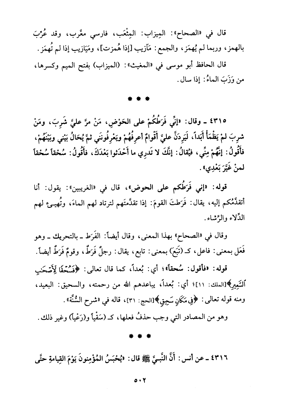 4315 - وقال: "إنَّي فَرَطُكُمْ على الحَوْضِ، مَنْ مرَّ عليَّ شَرِبَ، ومَنْ شرِبَ لمْ يَظْمَأْ أَبَدًا، لَيَرِدَنَّ عليَّ أَقْوامٌ أعرِفُهُمْ ويَعْرِفُونَني ثمَّ يُحَالُ بَيْني وبَيْنَهُمْ، فأَقُولُ: إنَّهُمْ مِنِّي، فيُقالُ: إنَّكَ لا تَدرِي ما أَحْدَثوا بَعْدَكَ، فأَقُولُ: سُحْقًا سُحْقًا لمنْ غَيَّرَ بَعْدِي".